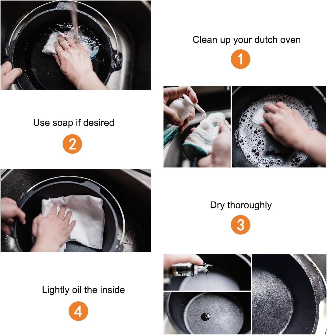 All-round Dutch Oven. The integral legs on both pot and lid allow the oven to sit perfectly over the campfire; the lid can also be used as a skillet for frying. Moreover, cast iron pots are not coated in toxic chemicals. It is a safe non-stick surface.