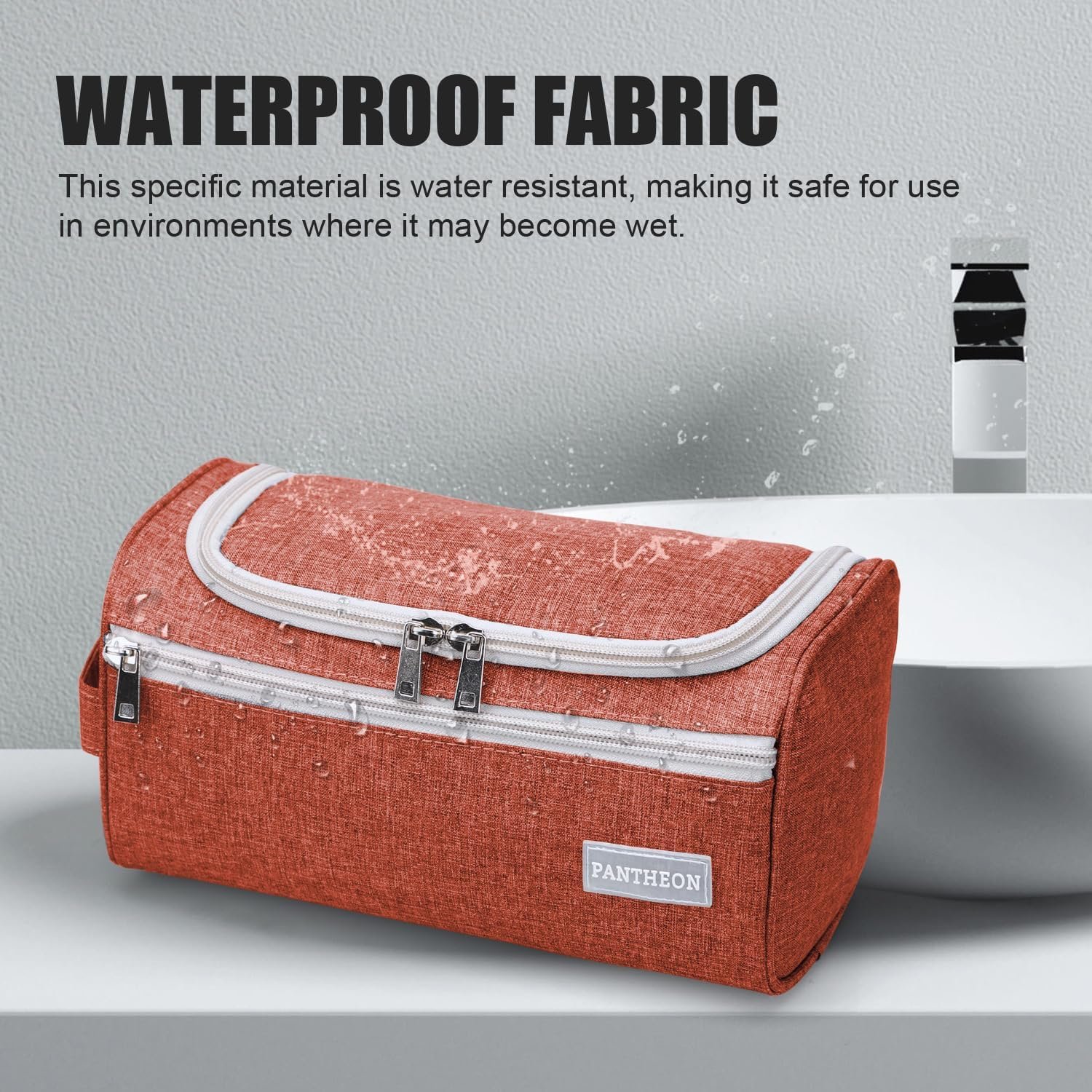 HIGH-QUALITY DURABLE MATERIAL: This exceptional toiletry travel bag by Pantheon is made of attractive Cationic Oxford cloth, which is known for its lightweight yet durable qualities, the perfect combination for traveling. This specific material is water resistant, making it safe for use in environments where it may become wet, such as a bathroom or shower area. The interior of the bag is securely lined with a special material that can handle accidental toiletry spills and can be easily cleaned t