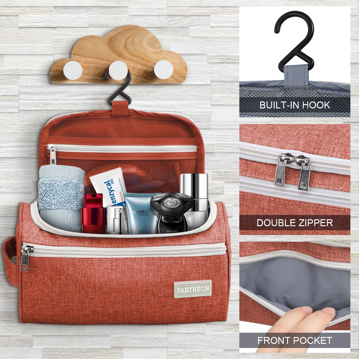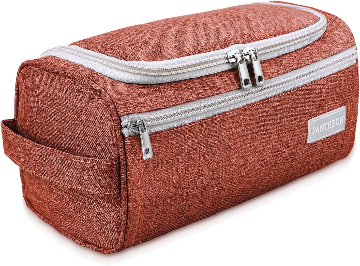 Pantheon Men’s Toiletry Bag – Travel Toiletry Bag Wash Bag Hanging Dopp Kit Shaving Kit for Bathroom Shower – Mens Travel Bag Hanging Toiletry Organizer Toiletry Kit for Traveling (Brick Red)