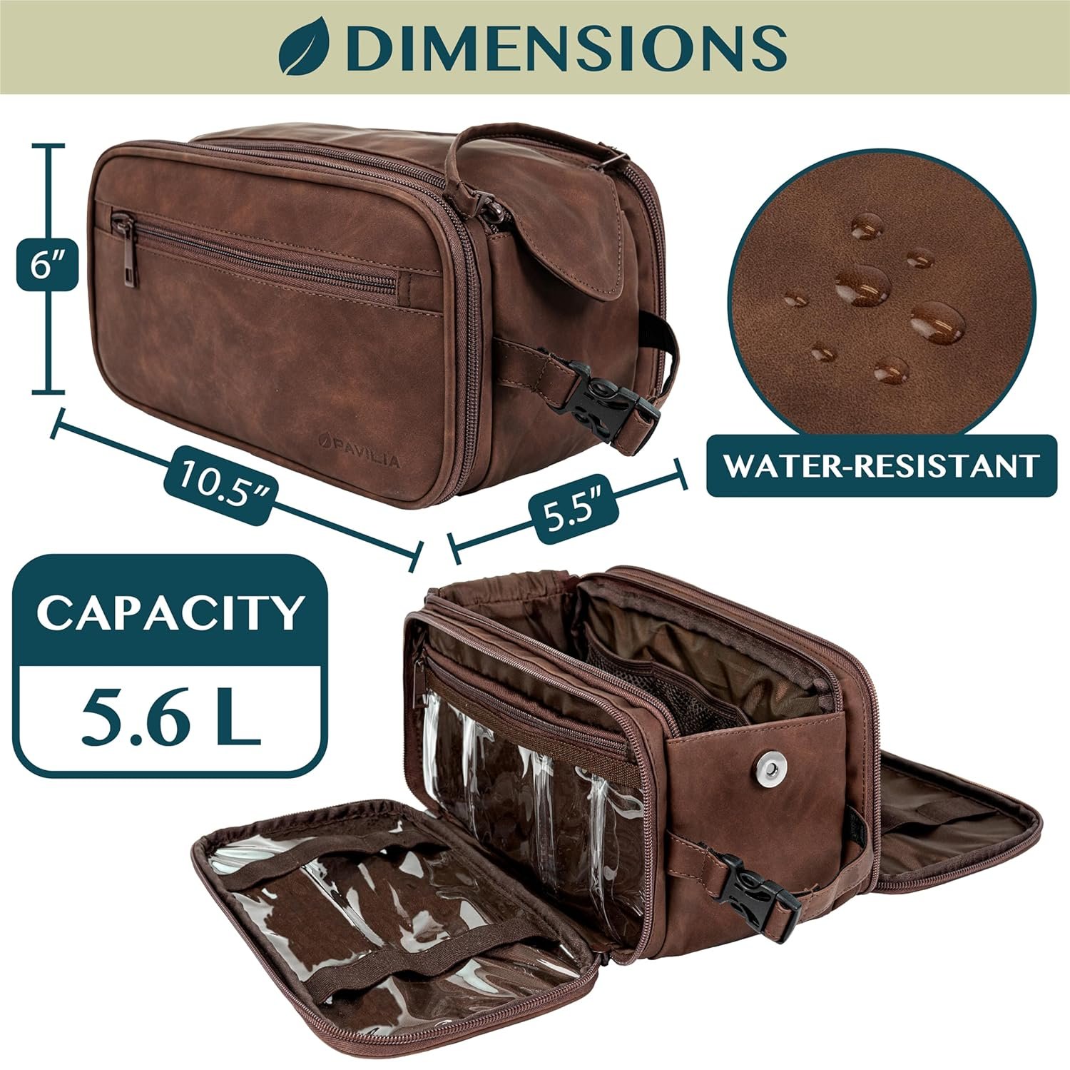 WATER RESISTANT TOILETRY BAG DOPP KIT: This toiletry case kit is made from high density PU leather with added side padding for durability and extra protection to keep your toiletries safe and protected during travel. The lining is water-resistant to prevent liquid splashes from entering the bag or luggage. The toiletry bag also offers excellent wet/dry separation so you can keep wet accessories in a separate compartment from dry toiletries during camping, road trips, weekenders.