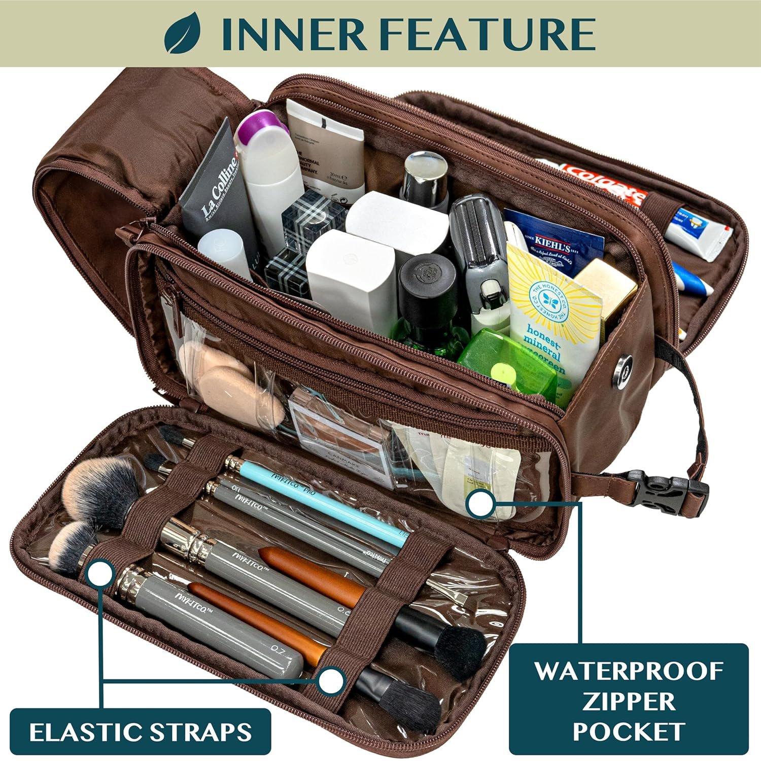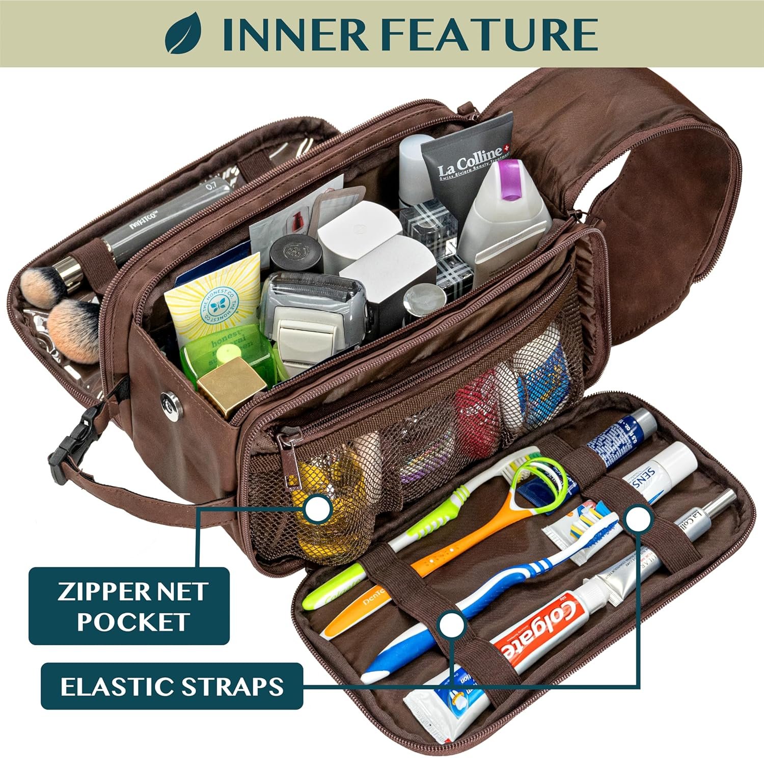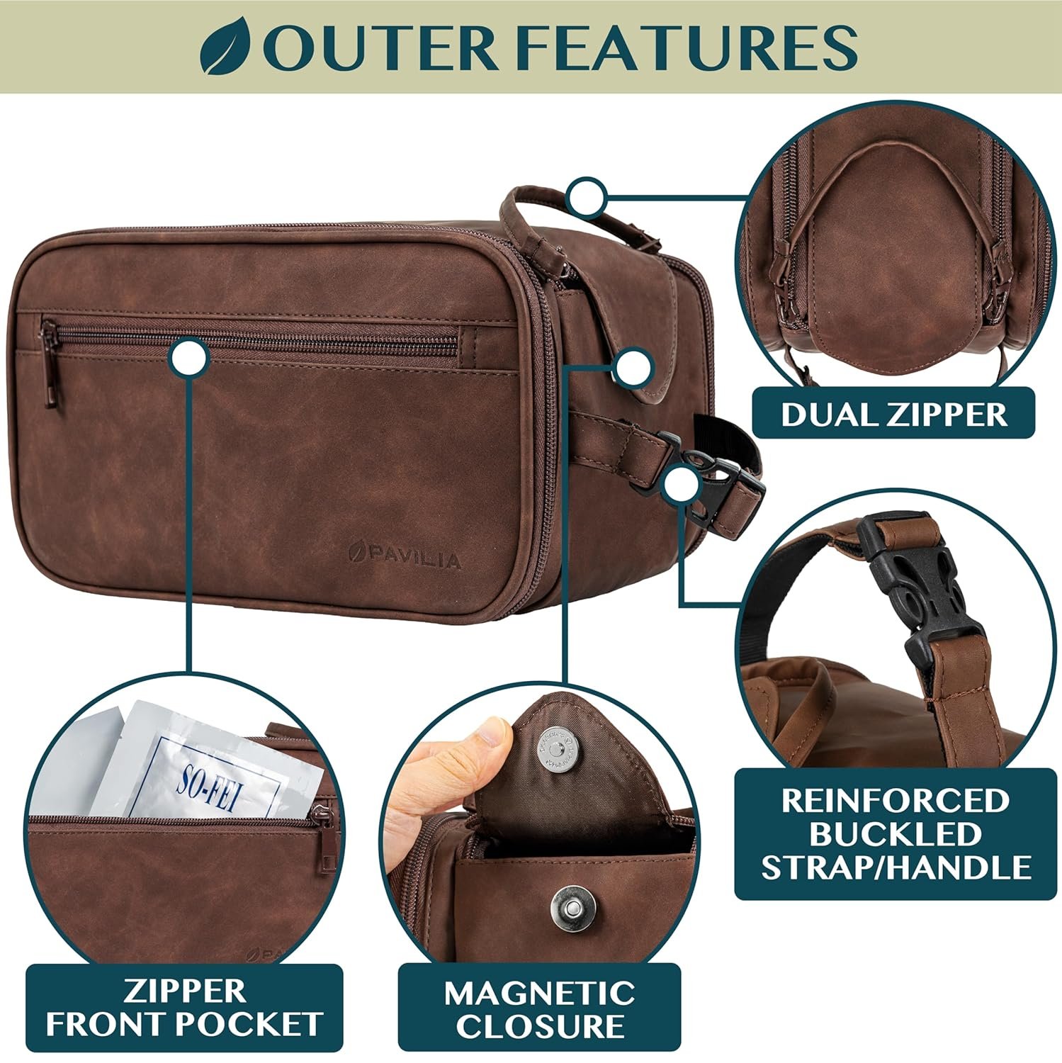 MENS TOILETRY BAG: This functional PU leather toiletry travel bag has a large compartment and side pockets with additional pockets to hold all your toiletry, shaving, and grooming accessories. Equipped with elastic bands and additional mesh pockets to keep your hygiene items secured while traveling, weekend trip at hotel, or at home, this cosmetic make up case will help you stay organized.