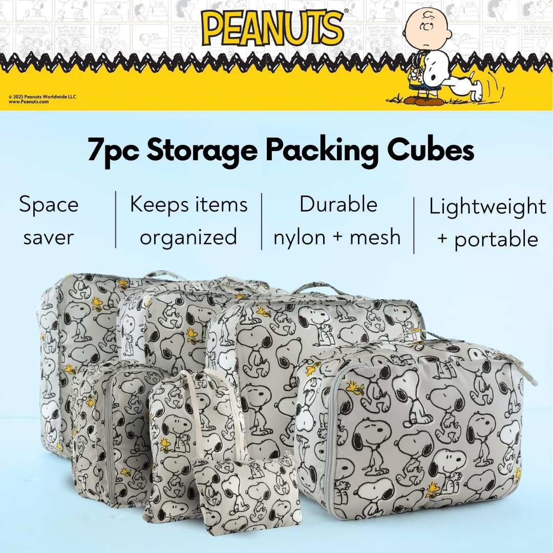 ITEM INCLUDES: This 7-piece Peanuts Snoopy storage packing cube set includes one extra-large packing cube (18″x13.75″x5″), one large packing cube (15.7″x11.8″x4.7″), one medium packing cube (12.9″x11″x4.7″), one drawstring bag (13.7″x10.6″), one underwear bag (11.8″x8.6″x4.7″), one toiletry bag (8.6″x6.6″x3.1″), and one sock bag (9.8″x6.2″). Perfect for all your travel essentials!