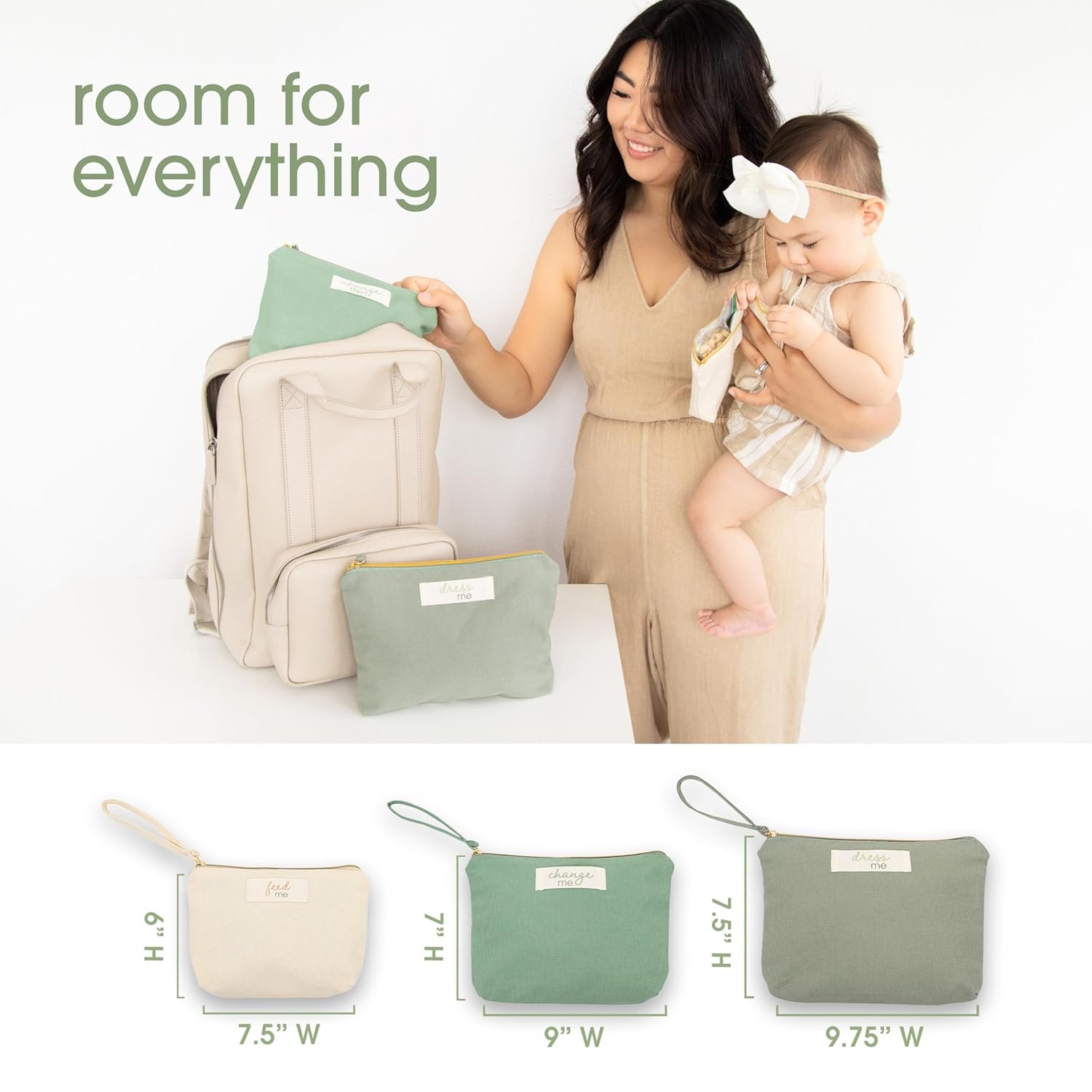 Stay Organized in Style: Easily manage your baby’s essentials with Pearhead’s 3-piece pouch set. Each pouch is labeled “Feed Me,” “Change Me,” and “Dress Me” in trendy muted green and neutral cream colors, helping you stay organized with a touch of style.