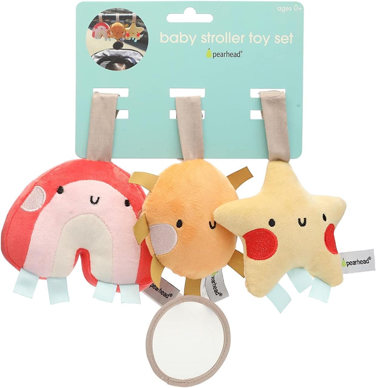 Your little one has arrived! Now it’s time to make sure you have all the newborn accessories you need to make traveling and being on the go with your baby girl or boy a breeze! This star, sun and rainbow stroller toy set by Pearhead is the perfect baby girl accessory or baby boy accessory for new parents and their little ones – and will quickly become a family favorite! This baby toy set includes three hanging plush toys, each with a hook and loop closure. Set includes 1 rainbow, 1 sun and 1 star with interactive tug tabs, squeakers, soft plush and lustrous silky textures, and a mirror to engage your baby’s senses and encourage your baby’s development! This stroller accessory or car seat accessory will make sure baby always has a toy to touch, see and hear. Whether you and your little one are off to daycare, playdates, the park, family visits, dinners or outings this toy set for baby will make getting there, and being there, more fun than ever before! When home, use this set as the perfect baby crib toy set and baby crib accessory set that will look adorable in any baby girl nursery or baby boy nursery. This toy set is the perfect giftable nursery accessory or baby accessory, making it a great gender-neutral baby gift, baby girl gift, baby boy gift, new mom gift, expecting mom gift, pregnancy gift, baby shower gift or addition to your own baby shower registry! Mom, dad and baby will all love the hours of baby play and family bonding they’ll be sure to get with this baby gift set. At Pearhead, we aim to create genuine, quality products to celebrate your special moments in life. We are a family of designers, marketers, and trendsetters bringing products to life that will bring a smile to your face. From concept and design to production and customer service, the Pearhead team works together seamlessly every step of the way. Whether your baby is celebrating their first year of life, you are announcing your pregnancy, or your pup is celebrating his first holiday season, Pearhead is here to share your moment in style. Each toy measures approximately: 4.5”W x 4.5”H x 1.6”D, ages 0+.