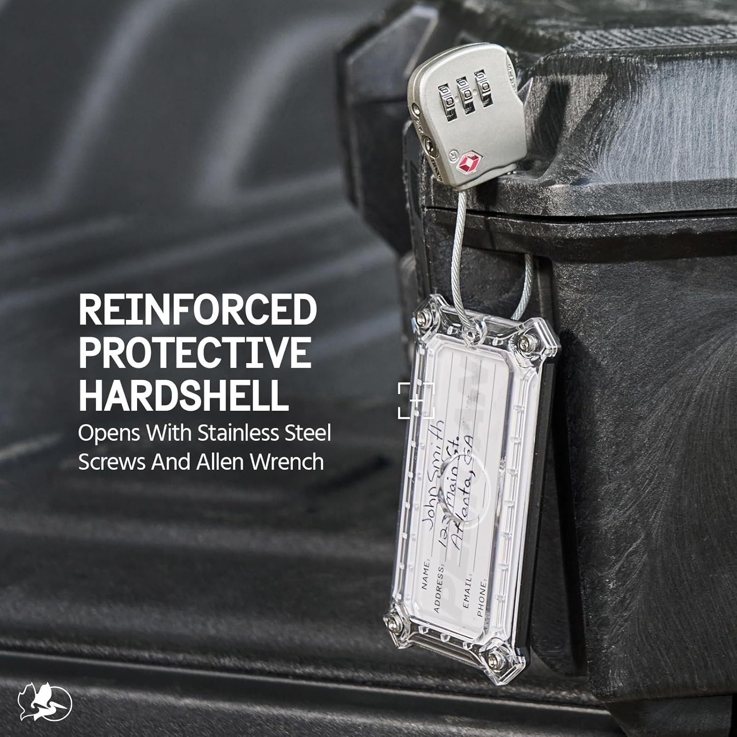 Reliable & Sturdy: The Protective AirTag luggage tag features a reinforced protective hardshell that opens with stainless steel screws and an Allen wrench, ensuring a secure closure; This reliable screw-locking mechanism is perfect for any adventure, preventing your AirTag from falling out; The detachable TSA-approved stainless steel cable lock allows you to attach this luggage tracker to various items, such as bags, suitcases, and other items, whether you’re traveling by air, sea, or land