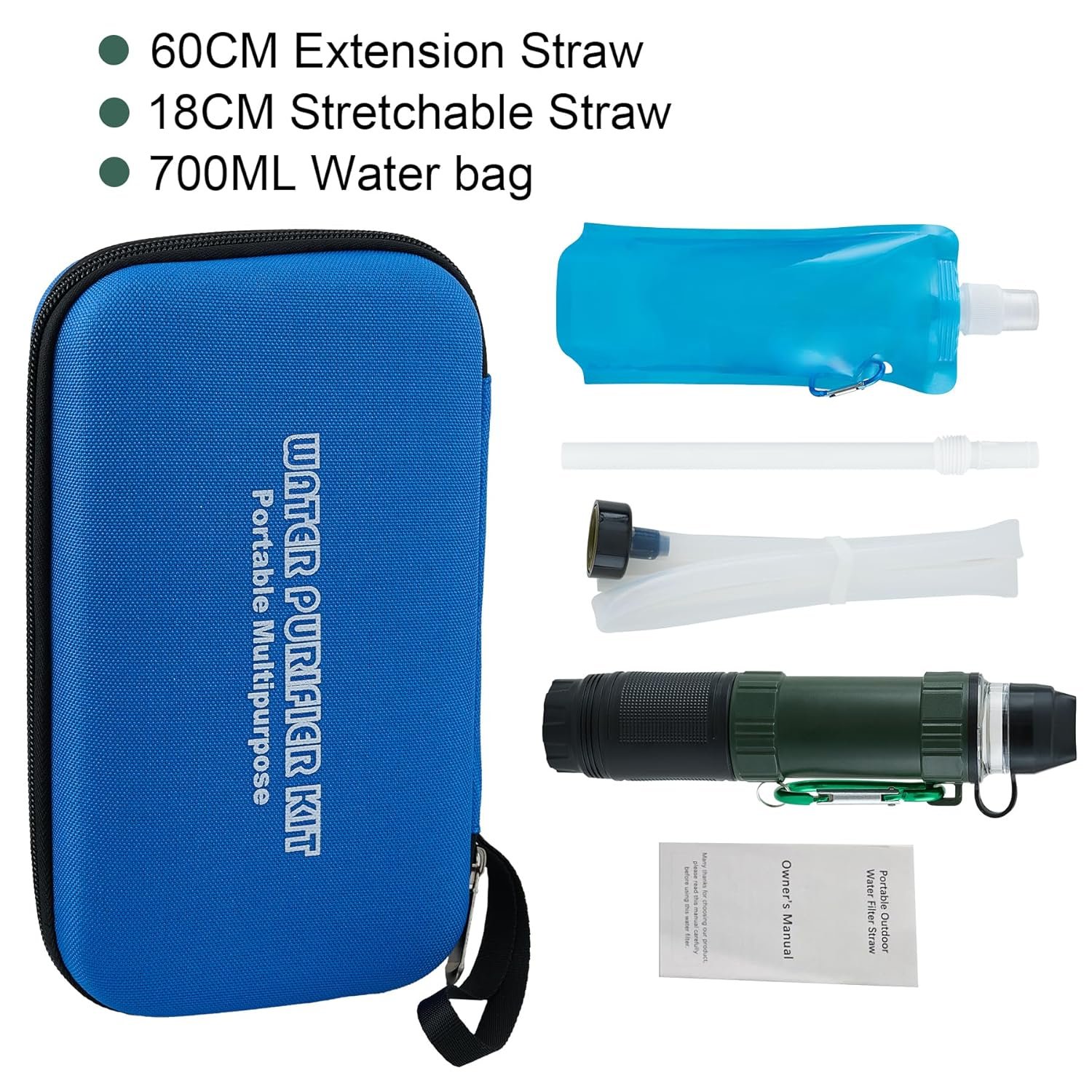 This water filter straw can purify natural water such as river, rain and lake water into direct drinking water.Includes: water filter(7.1 inch x 1.85 inch)x 1,60mm mountaineering buckle x 1, 18cm telescopic extension tube x 1, 60CM silicone extension tube x 1, 700ml blue water bag x 1, EVA bag x 1.