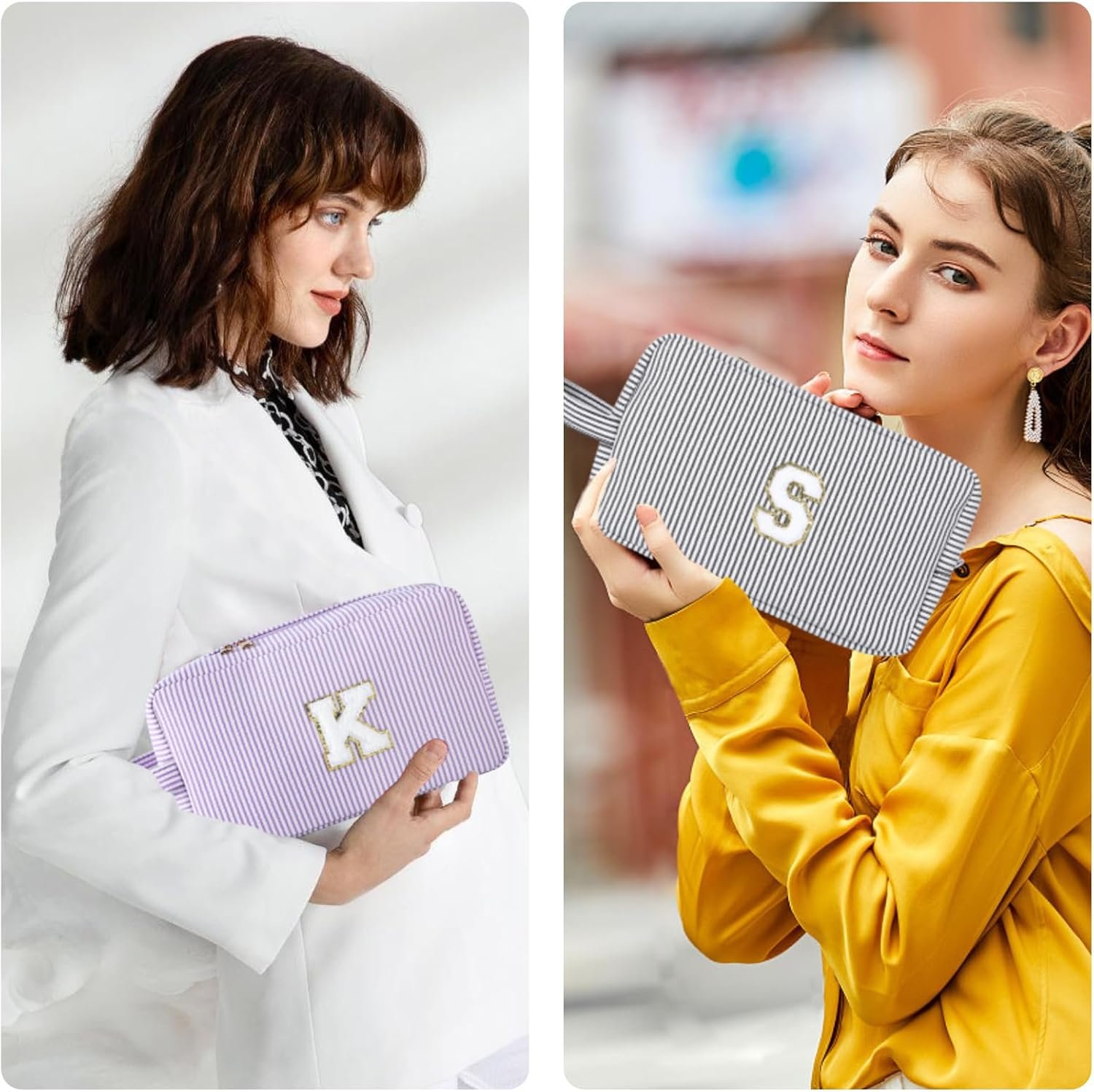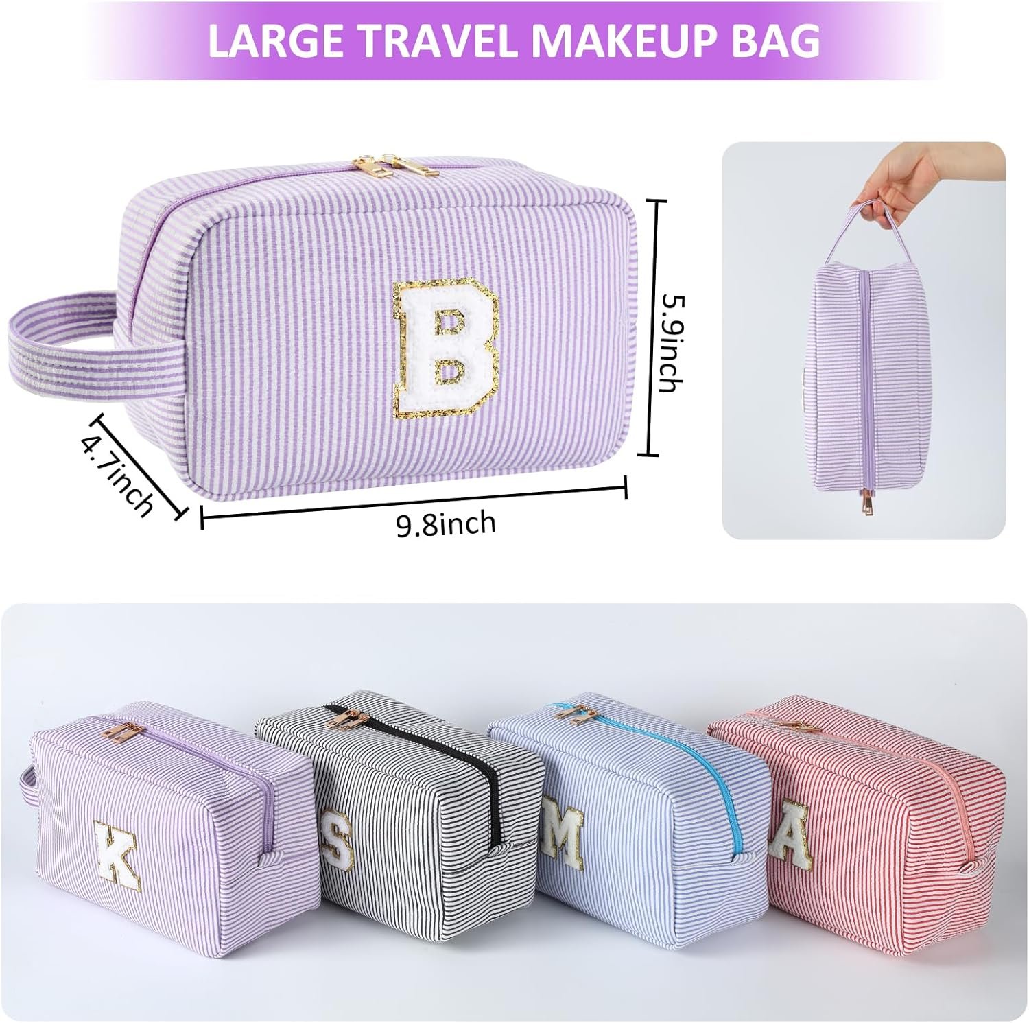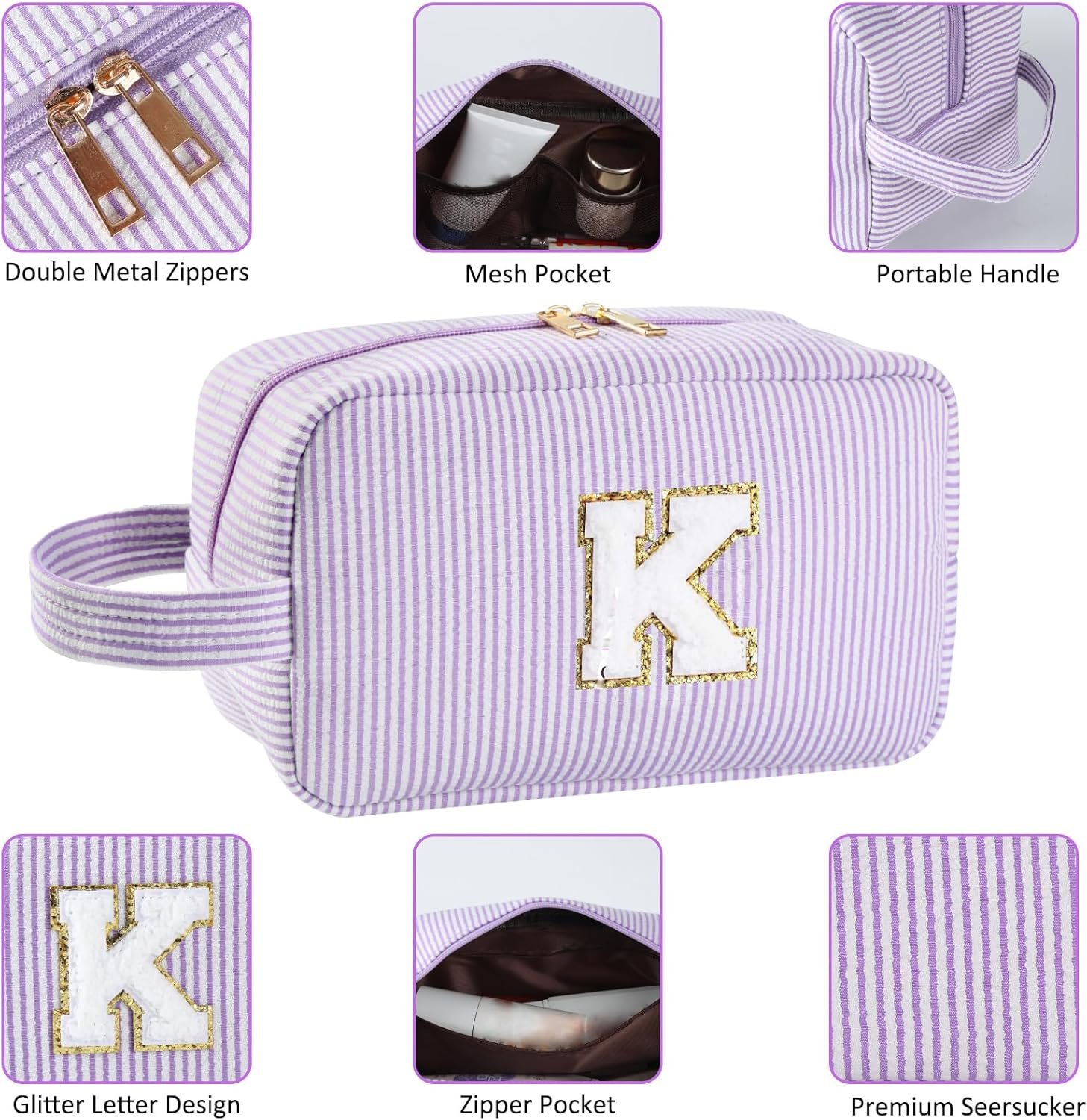 Large Capacity and Durable Materials: The cute initial makeup bag is 9.8 in * 4.7 in * 5.9 in, which can hold a variety of contents at the same time, like liquid foundation, lipstick, sunscreen, sunglasses, mobile phone, toner, makeup brush, swimsuit and so on. The personalized gifts cosmetic bag is made of durable seersucker material, which is of better quality, lighter and easier to clean and carry. The metal double zipper and portable handle are the best choice for both at home and traveling