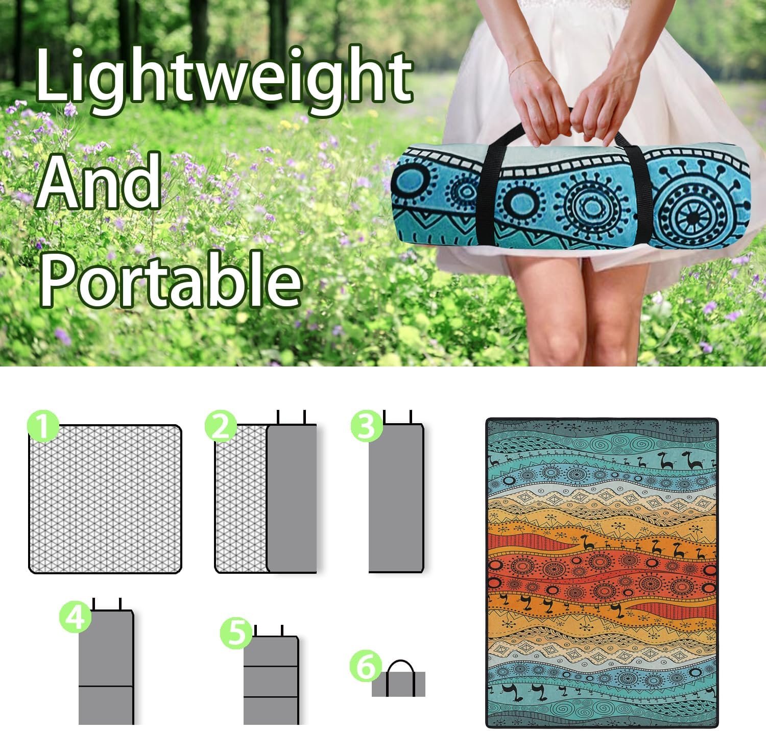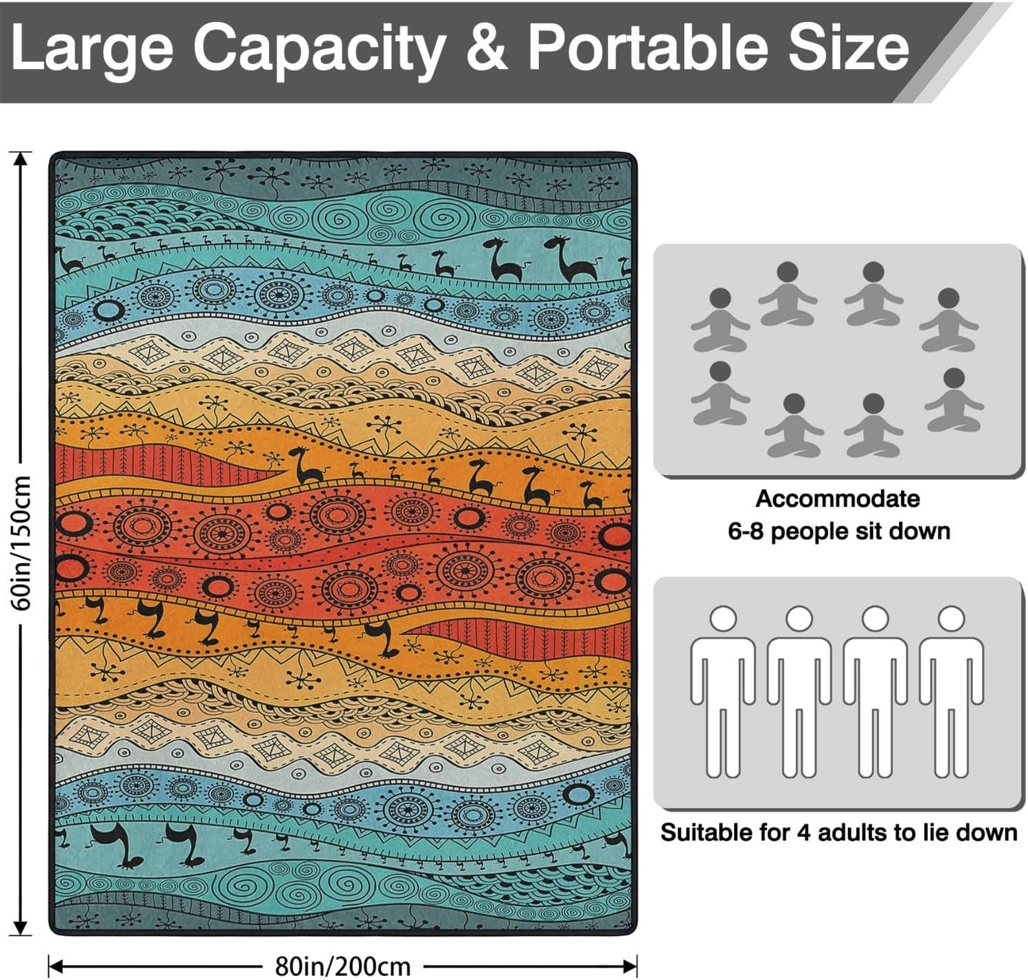 Sutible Size:Picnic blankets unfolded size is 60”x 80”, Weighs Only 2 Pounds. to fit for 6-8 adults for siting or 4 adults of lying,spring summer camping blanket great for perfectly suitable for siting or lying on grass, beach, floor or any kindly of surface, giving you soft and comfortable feelings
