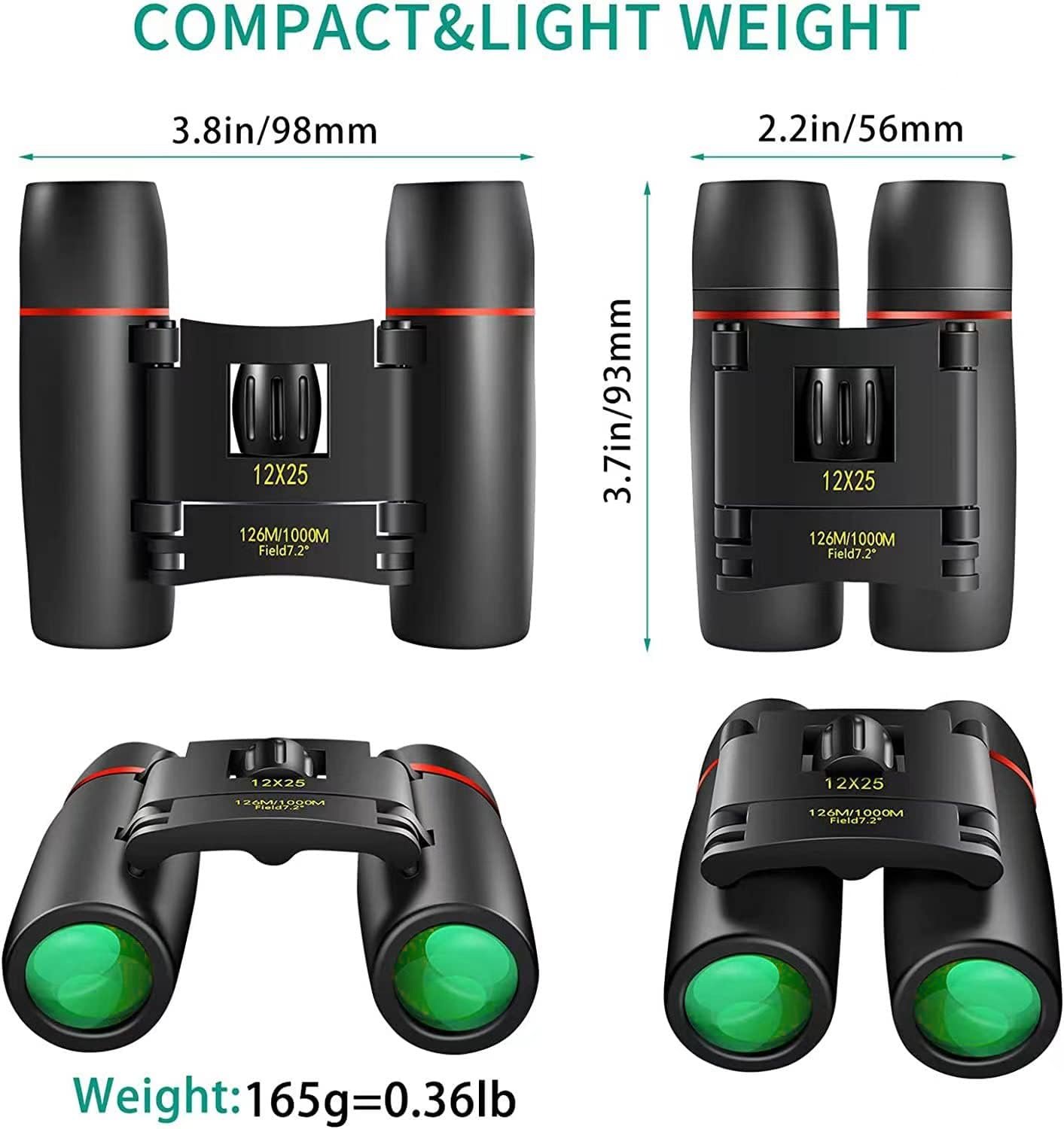 Compact Binoculars Clear vision: 12×25 optics binoculars with a 12X magnification and objective lens diameter of 25 mm, What’s more is with the large field of view-126ft/1000 yards, you can see the entire visual field for capturing objects easily