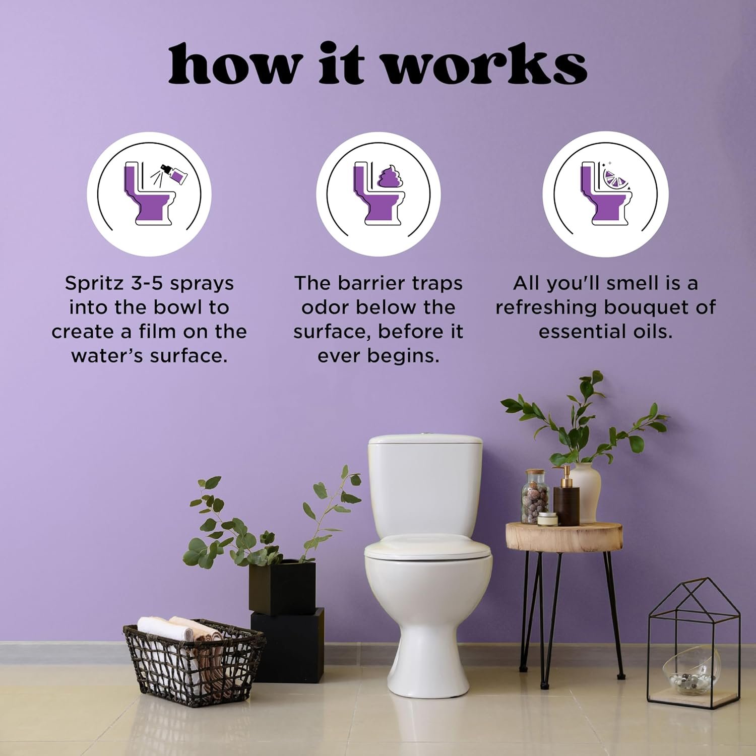 How It Works: Shake well. Spritz 3-5 sprays into the toilet bowl on the water’s surface. Proceed to do your thing