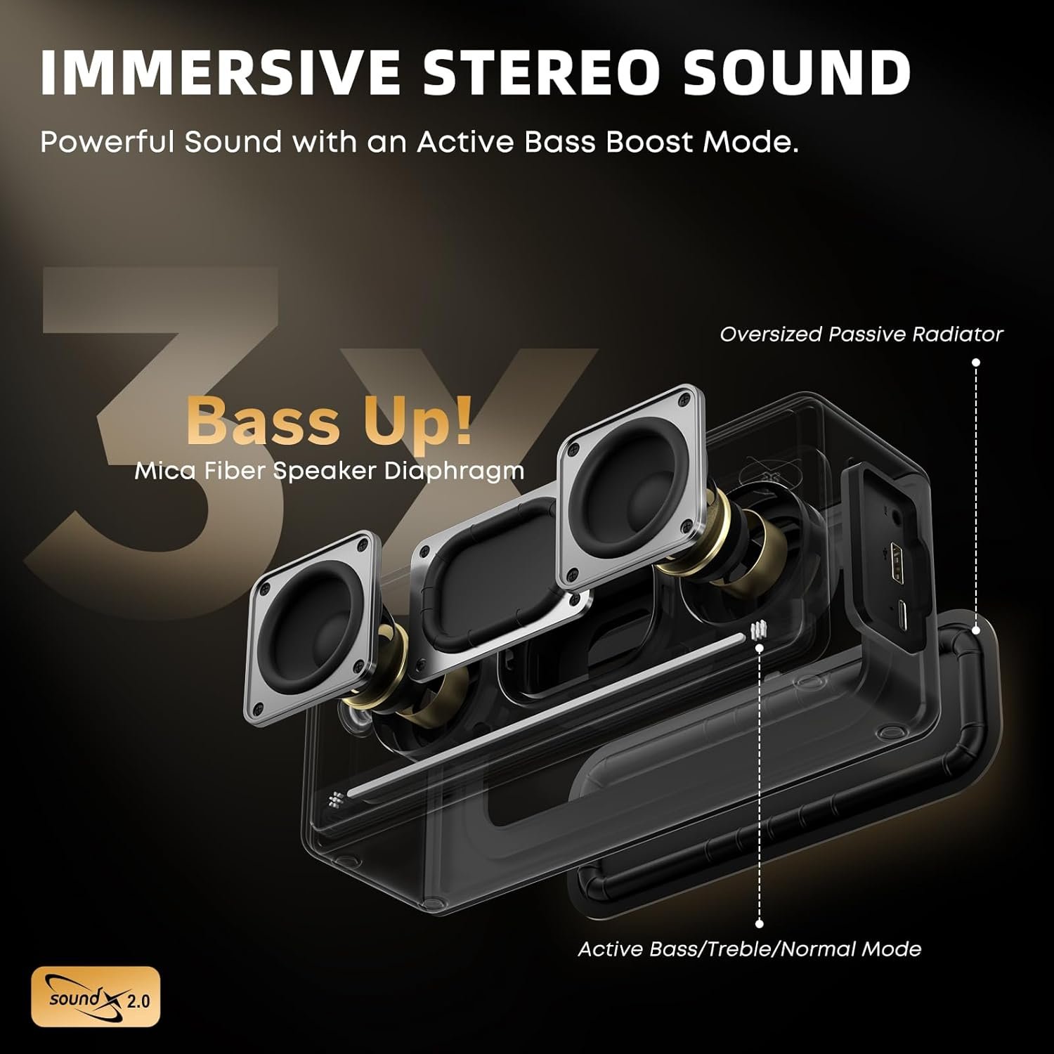 [Immersive Sound & Powerful Bass] Elevate your audio experience with this wireless Bluetooth speaker. Its 3x-sized passive radiator delivers powerful, deep bass, while adjustable bass and treble modes allow for personalized sound settings. Advanced SoundX 2.0 technology ensures minimal distortion for crystal-clear music, even at high volumes. Perfect for any setting, this portable speaker brings your music to life with exceptional clarity and depth.
