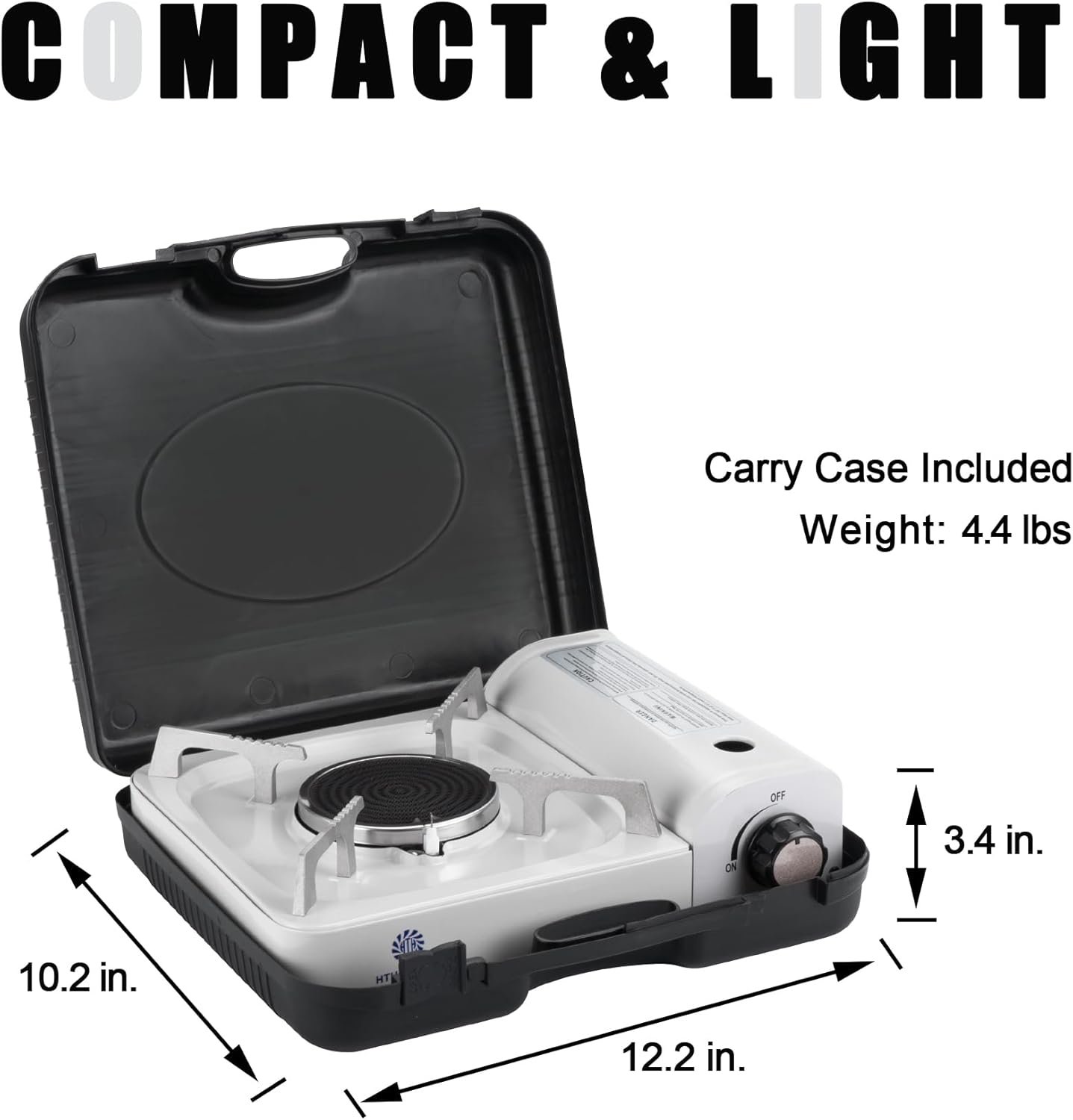Portable stove:the single butane stove takes up less space and lighter with carry case.Easy for backpackers and camper,be rugged enough to withstand travel in the back of a car.