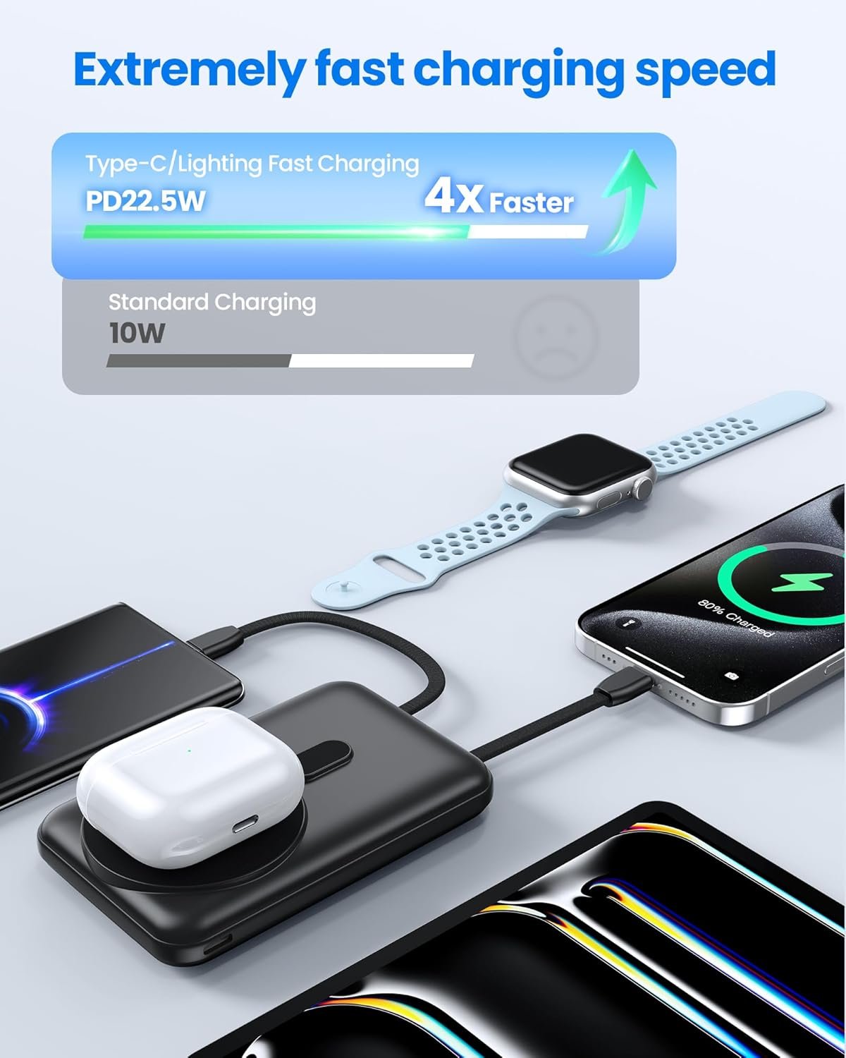 High-Capacity, All-Day Power : With a robust 10000mAh magnetic power bank, you’ll never run out of battery again. This travel-friendly portable power bank delivers fast charging up to 22.5W via Type-C, 18W with Lightning, and 15W wirelessly. Stay connected and productive wherever life takes you.