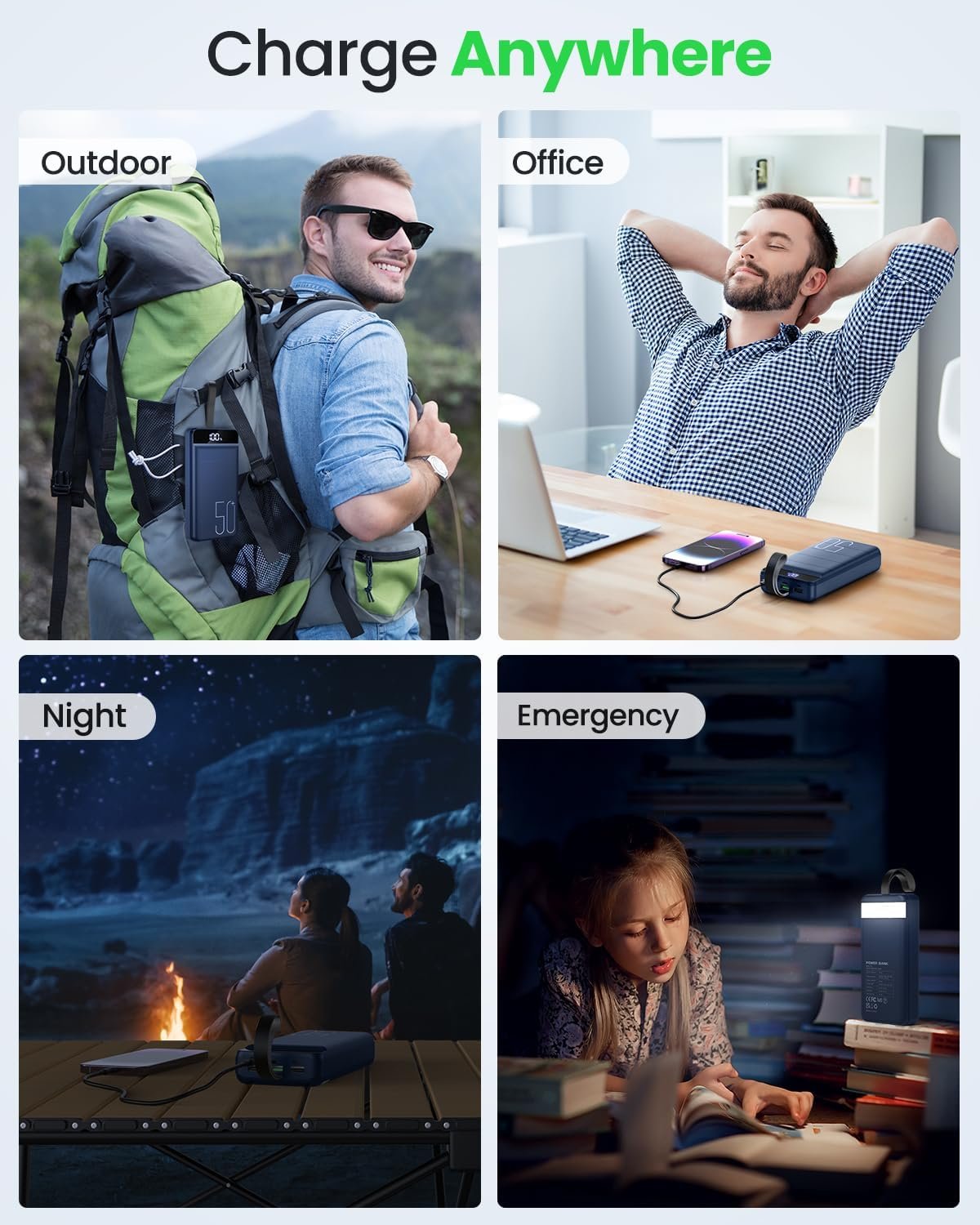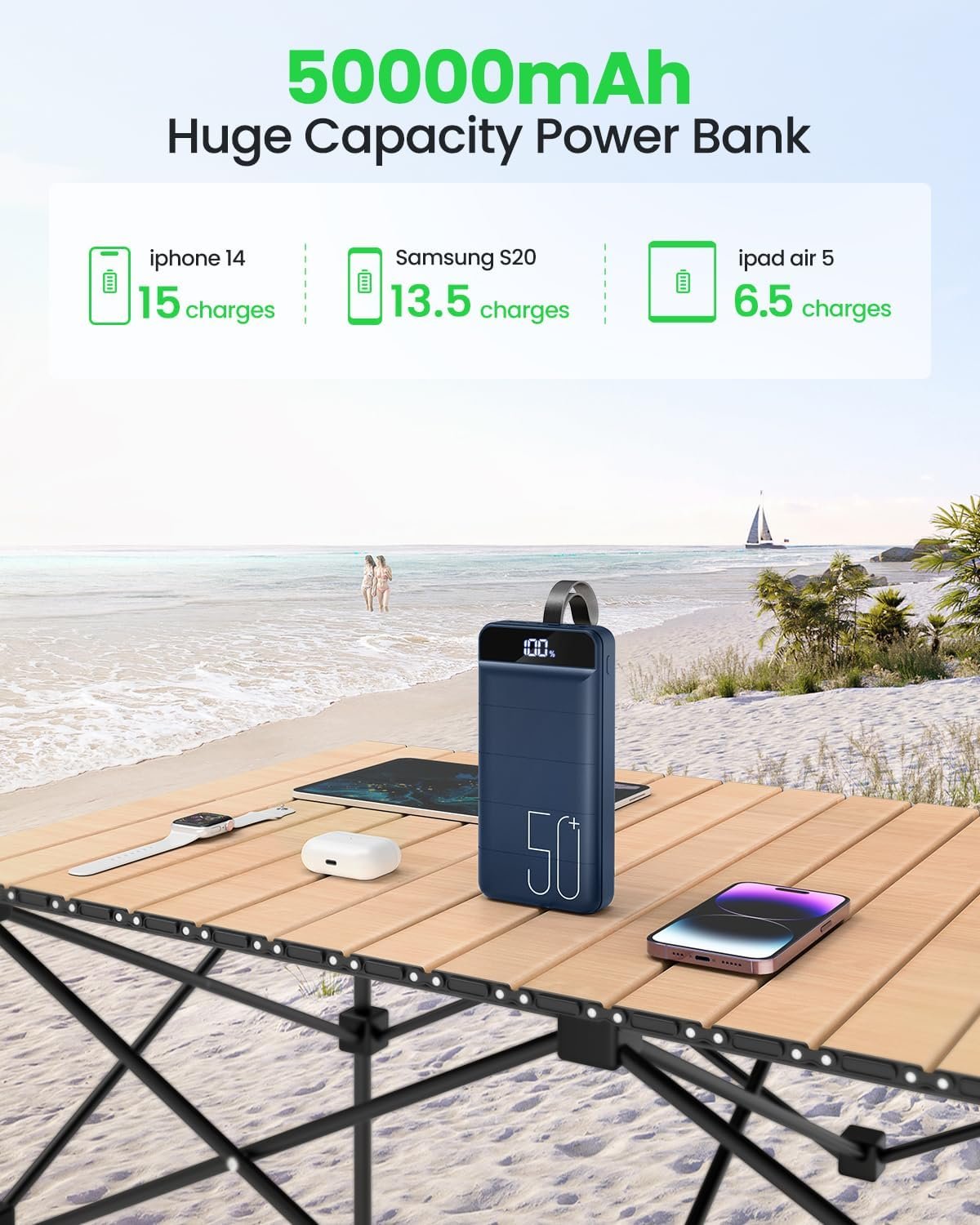 50000mAh Huge Capacity Power Bank: 50000mAh high capacity portable charger can keep your devices for a week. 14 charges for iphone 15, 13.5 times for Samsung S20, most smartphones will get over 10 full charges with this battery bank 50000mah. Is a travel essential make you get rid of the anxiety about the battery level of your devices. Large Power pack for camping, travel, hiking, fishing, and more outdoor activities