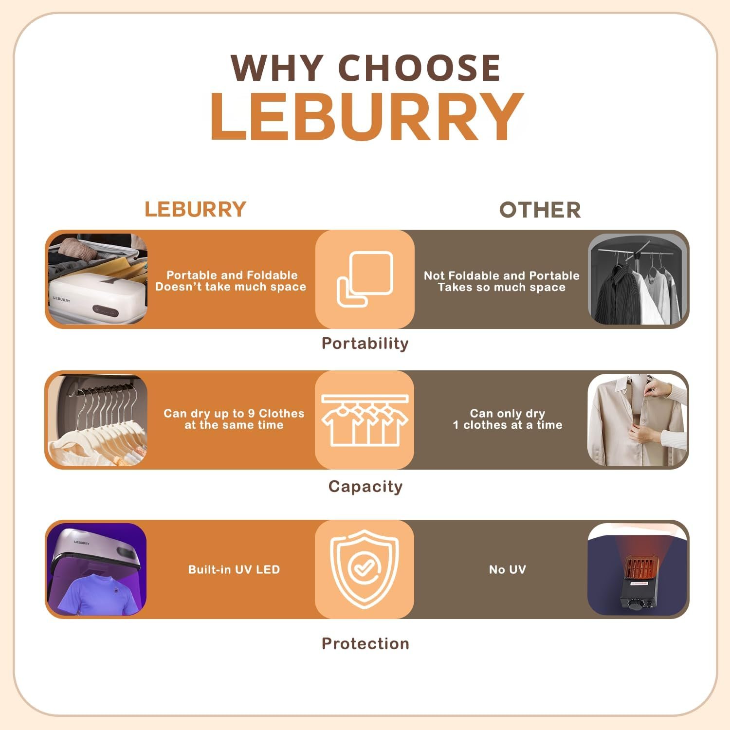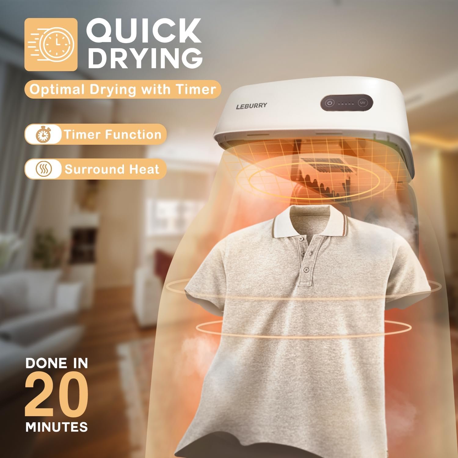 Portable Clothes Dryer: The Leburry clothes dryer is designed for efficient and effortless clothes drying, accommodating up to 9 clothes at once. It comes with a dryer bag that enhances drying efficiency by retaining hot air, ensuring swift drying times. Installation is simple: securely attach the dryer bag, hang the machine on a stable rod, and set the drying time. This portable dryer is ideal for adult and baby clothes, underwear, plush toys, and various fabrics.