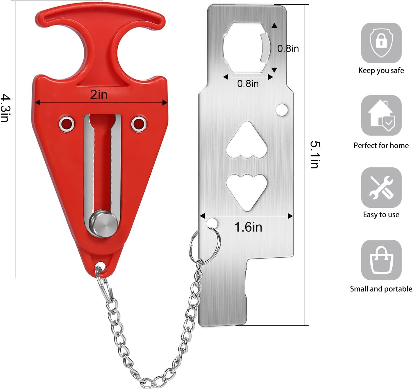 After several upgrade iterations, the portable door lock has two different structures of lock holes: 0.78 inches for ordinary doors, and straight buckles for more inner door lock holes.