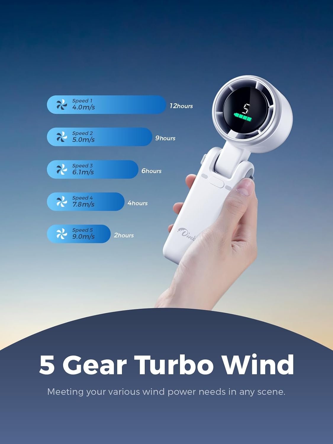 5 Gear Turbo Wind- Experience personalized comfort through the adjustable wind speed settings of the handheld personal fan. From light breezes to strong winds, we offer 5 wind speed settings that you can adjust to meet your specific cooling needs in any situation.