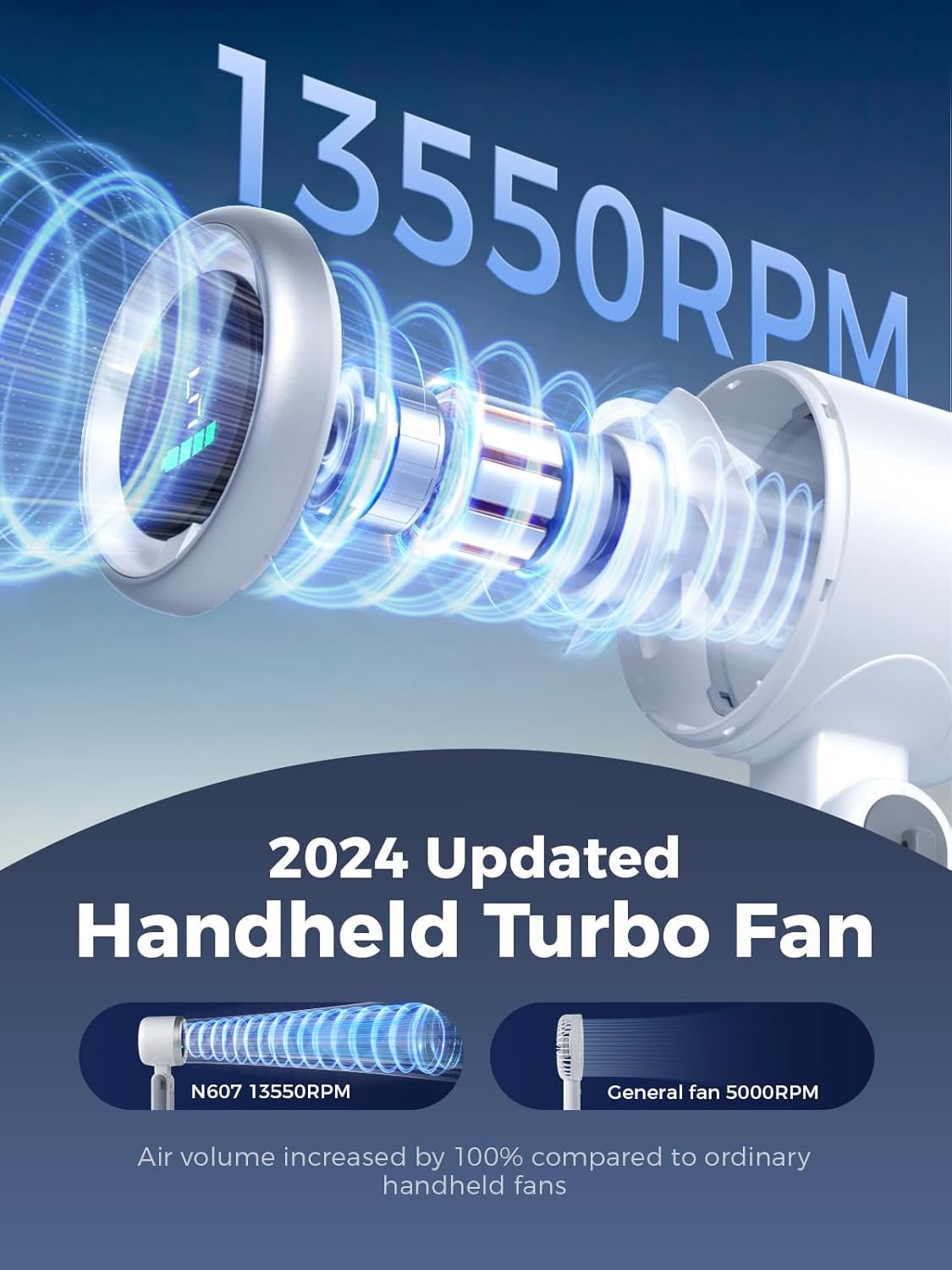 Ultimate Cooling Experience – This N607 handheld turbo fan adopts an advanced 6-blade design and is equipped with a high-speed three-phase brushless motor, with a maximum wind speed of up to 10m/s. Maximum speed is 13,500 rpm, which is 3 times that of ordinary handheld fans. Perfect for relieving the heat during hot journeys.