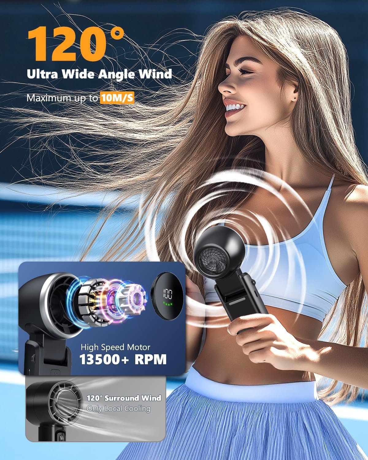 【Unmatched Cooling Experience】- Say goodbye to sweltering heat with JINLICTE portable handheld turbo fan, featuring 6-blade design and brushless motor that delivers a max wind speed of 10m/s. Max speed is 13,500 rpm, which is 3 times that of ordinary handheld fans. Perfect for relieving the heat during hot journeys.