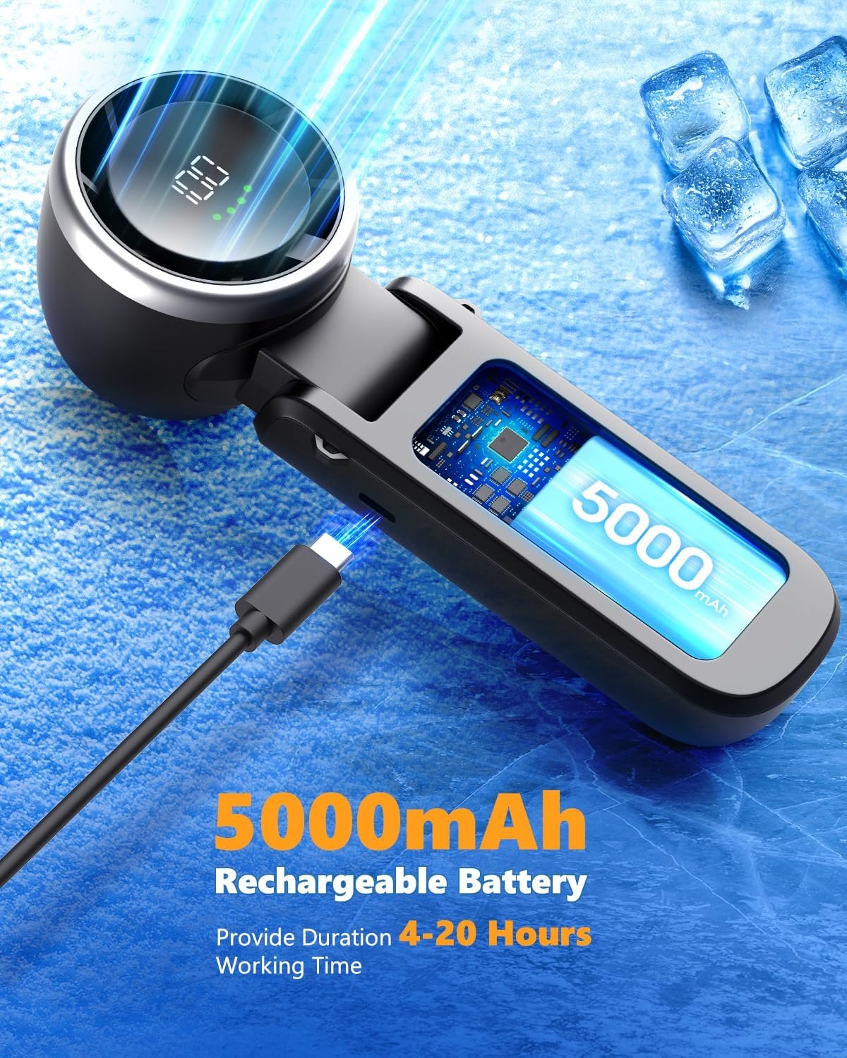 【Brushless Motor – Super Power】- Why settle for weak airflow and short battery life? The JINLICTE portable fan combines a high-performance brushless motor with a 5000mAh rechargeable battery, offering unmatched power and endurance. Enjoy 4-20 hours of continuous cooling on a single charge, making it the perfect companion for long trips, outdoor adventures, or even a full day at the office.