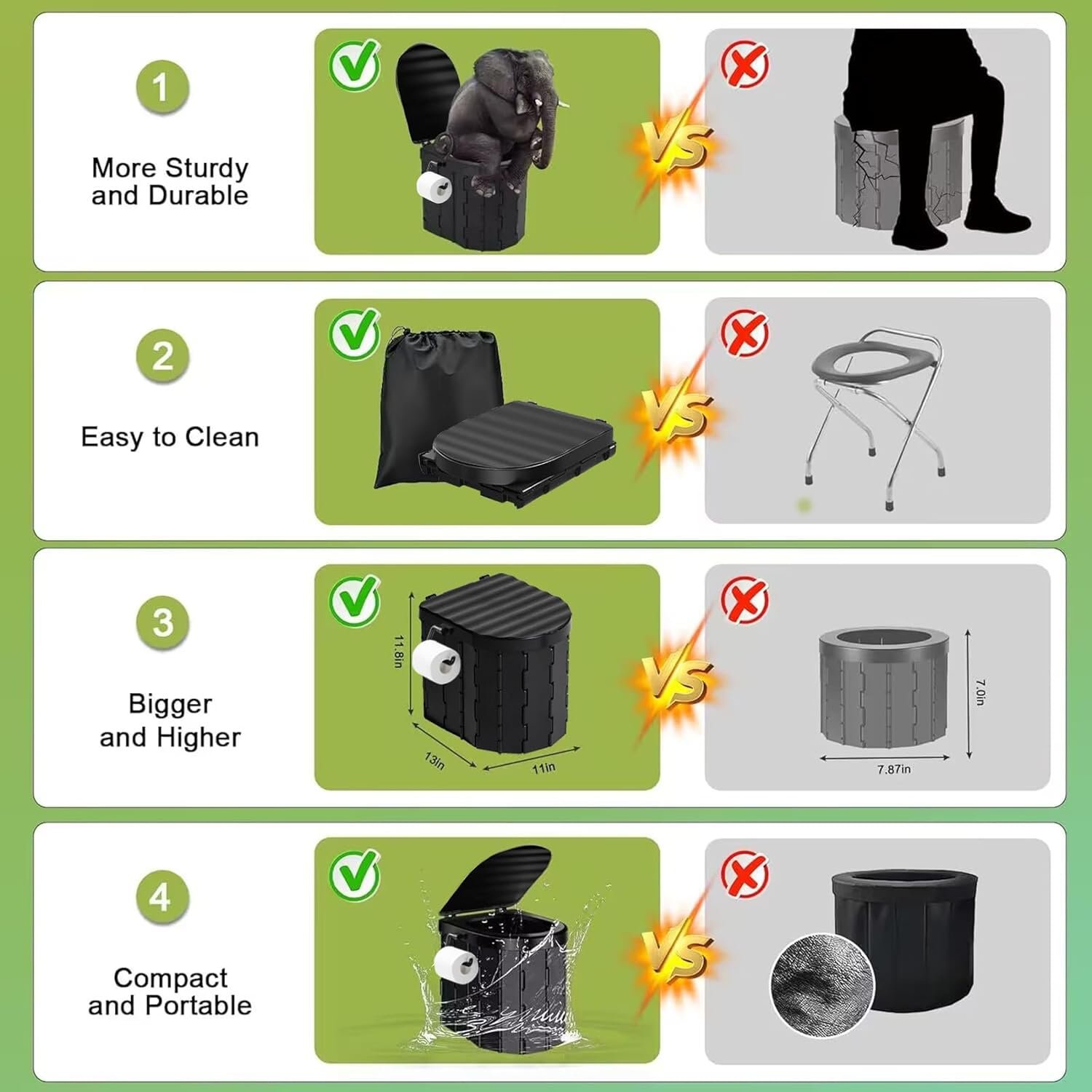 【Practical outdoor toilet】Our toilet can be contracted up and down, it has a very small footprint to recycle, it does not need to be assembled, and it is high enough for most Americans, outdoor toilet is stable and durable, can withstand 400 pounds.