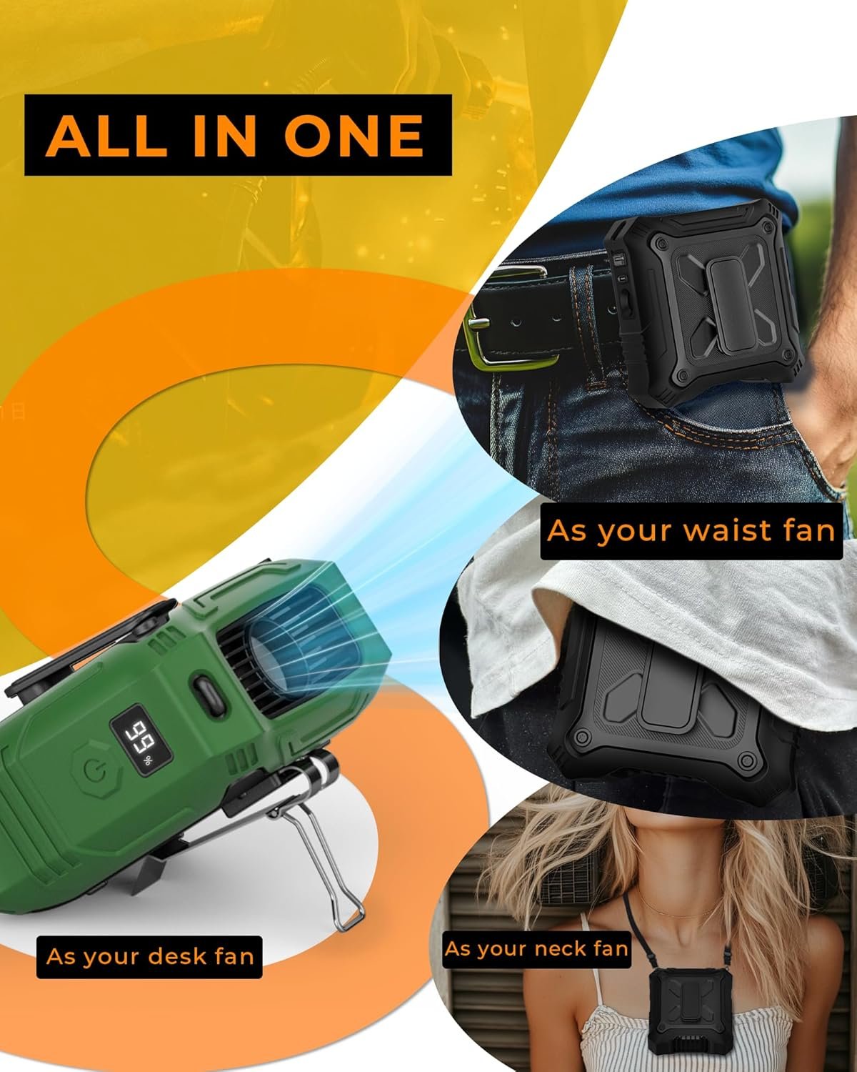 ALL IN ONE: This fan can be used as a neck fan, waist fan, desk fan, shirt fan, or belt fan—perfect for summer activities and outdoor adventures, making it an essential travel companion.