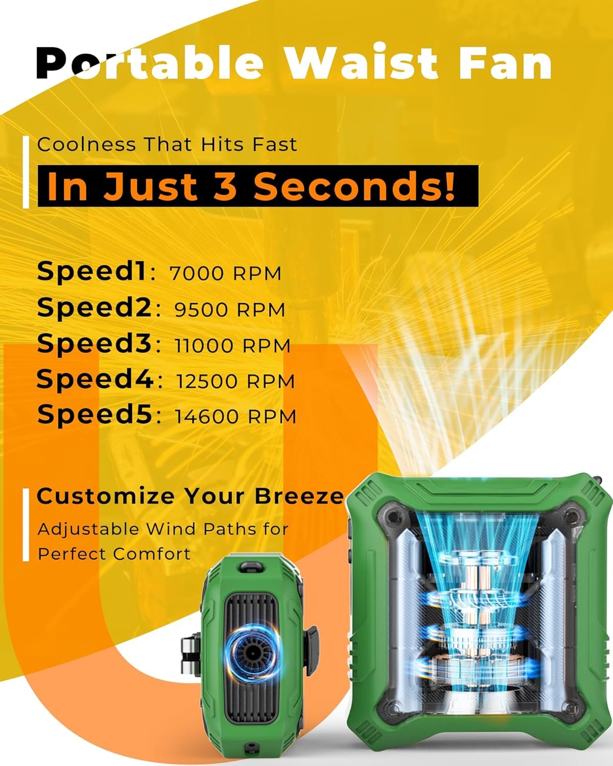 PORTABLE FAN: With a high-speed brushless motor and 5 adjustable speed settings (7000-14600 RPM), this fan delivers powerful airflow. The Adjustable Air Outlet lets you tweak both the position and direction of the breeze, ensuring it’s just right for you. Want a gentle breeze or a gust of wind? You’re in control!