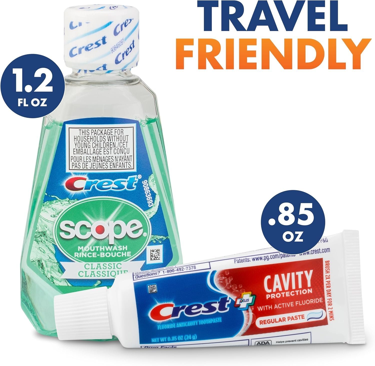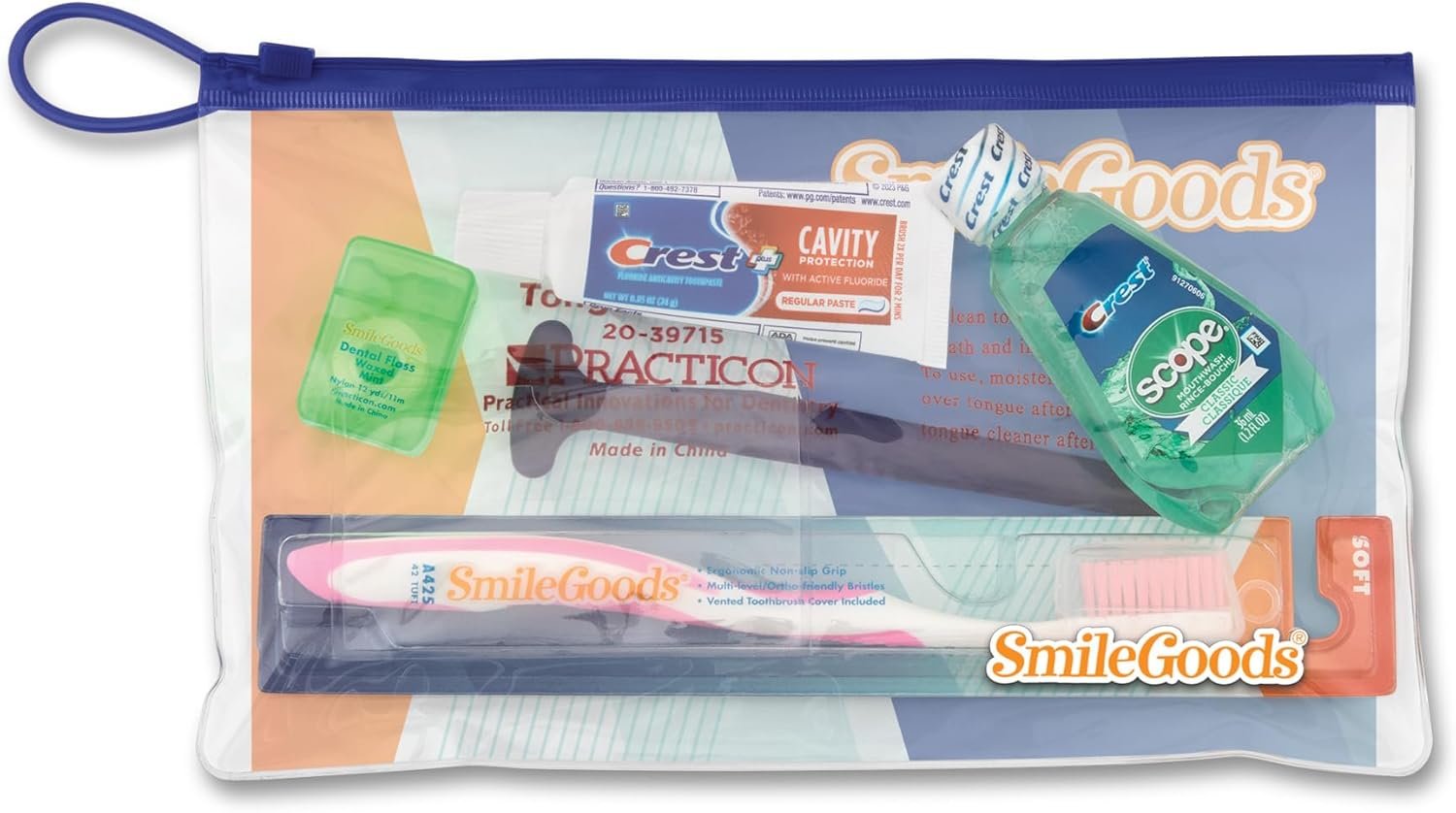 Travel Kit Includes: A425 SmileGoods toothbrush with an ergonomic non-slip grip, multi-level ortho-friendly bristles and a vented toothbrush cover, SmileGoods waxed mint floss, 1.5 oz bottle of Scope mouthwash, 0.85 oz. tube of Crest toothpaste and plastic tongue cleaner.