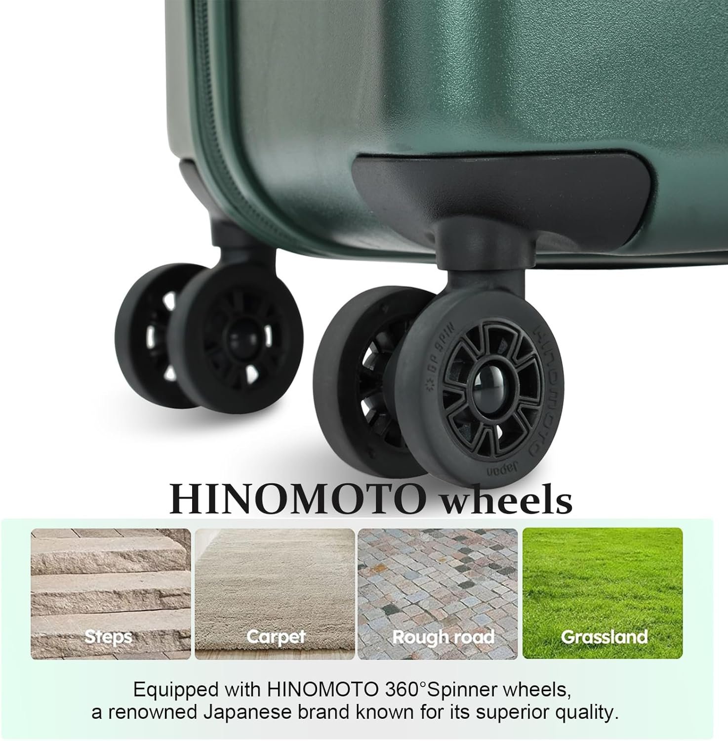 Silent Glide, Effortless Travel: Equipped with HINOMOTO wheels, a renowned Japanese brand known for its superior quality, our luggage ensures a quiet and smooth rolling experience. These wear-resistant wheels are designed to glide effortlessly, allowing you to navigate through airports or crowded places with ease.