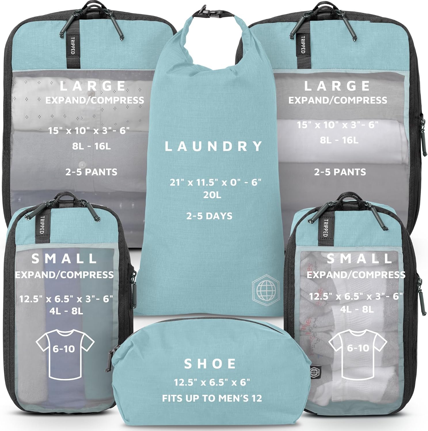 Maximize your travel efficiency with our Compression Packing Cubes for Travel, featuring a premium set of compression packaging cubes, including a laundry bag and shoe bag by TRIPPED Travel Gear, designed as the ultimate travel cubes for packing, perfect for carry on luggage, while our travel compression bags for packing ensure you can fit more in your suitcase; these packing cubes for suitcases and luggage cubes for packing are ideal for organizing your belongings, making your journey seamless with our suitcase organizer bags set, comparable to gonex compression packing cubes and eagle creek compression packing cubes, and essential for any traveler looking for effective luggage packing cubes for travel.