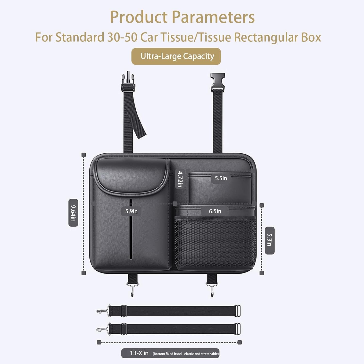 All-in-One Storage Solution – Features a dedicated cup pouch, a spacious tissue compartment (fits standard 30-50 sheet car tissue packs), and multiple pockets for phones, keys, snacks, or napkins, keeping your car interior tidy