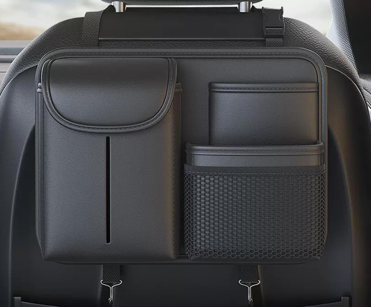 Premium Leather Car Seat Back Organizer with Cup and Tissue Holder, Multi-Pocket Storage with Adjustable Straps for SUVs, Trucks, Sedans (Black)