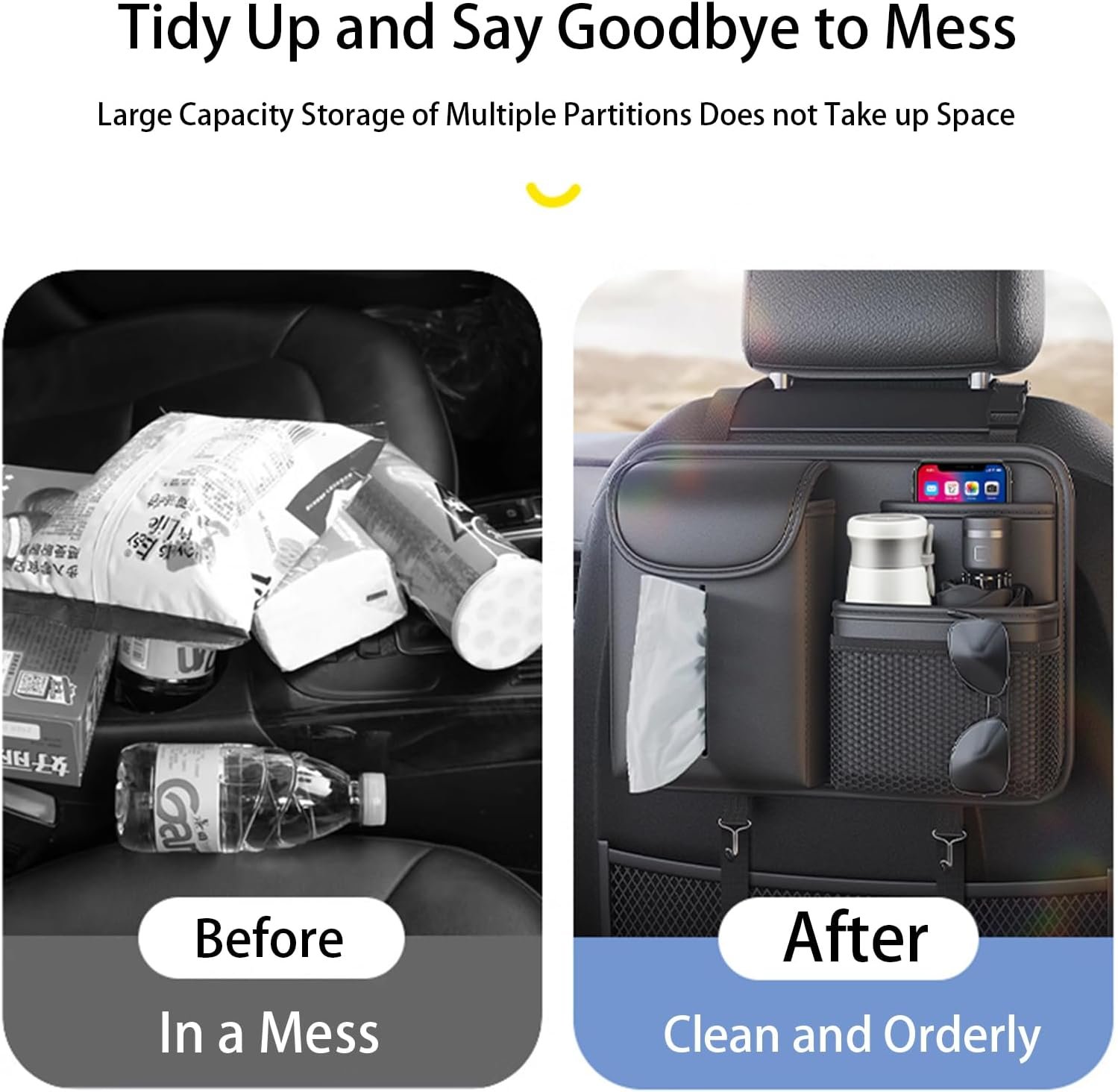 Secure & Adjustable Attachment – Easily fastens to front seat backs using sturdy adjustable straps, compatible with most vehicles without damaging upholstery or obstructing legroom