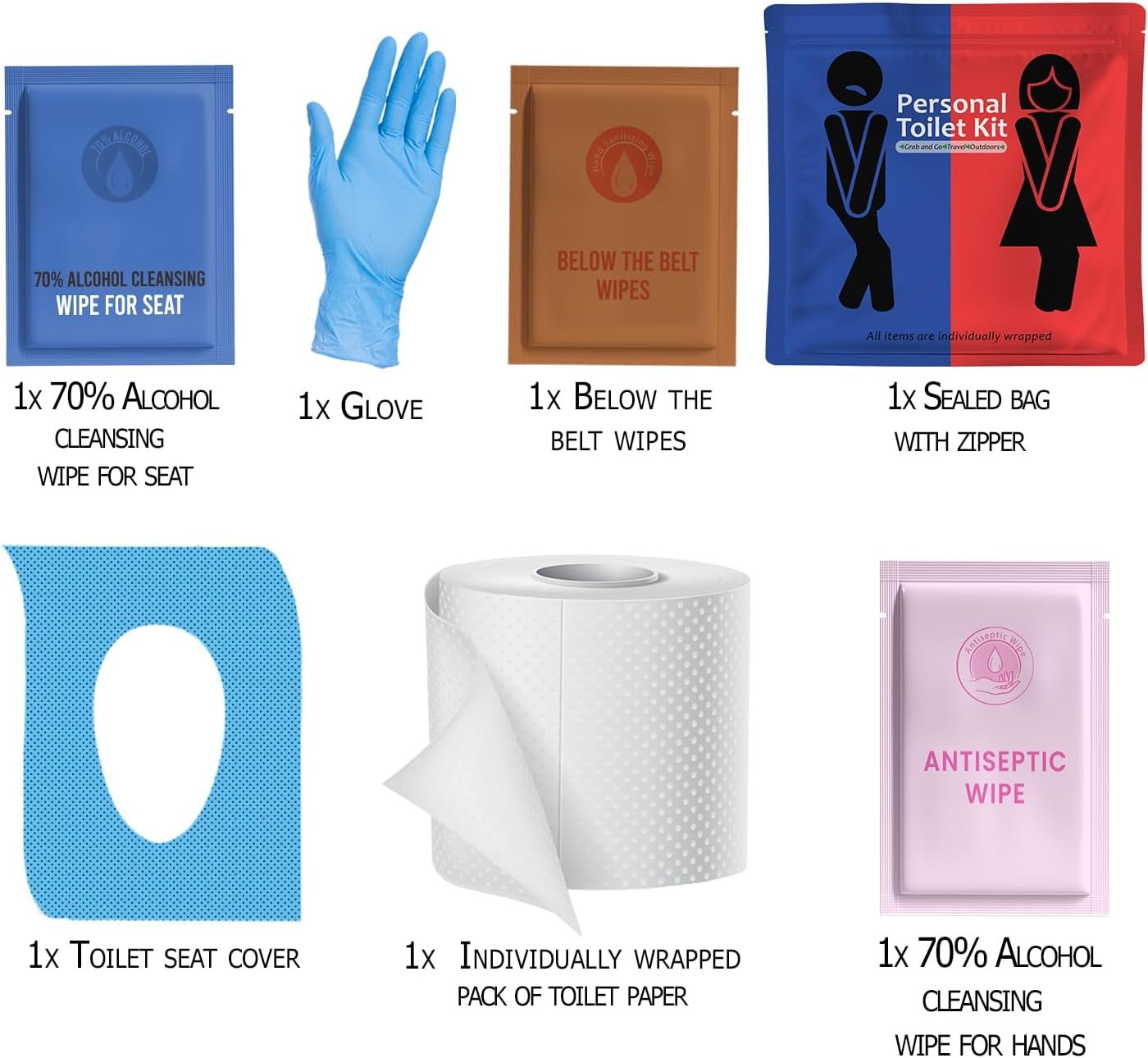 ALL THE ESSENTIALS YOU NEED– Each Individual Pack comes with: 1 – Glove, 1 – Toilet Seat Cleansing Wipe, 1 – Toilet Seat Cover, 1 – Packet of Individually wrapped Toilet Paper, 2 – Below the Belt Wipes, 1 – 70% Alcohol Hand Cleansing Wipe all packed together in a a convenient to carry Zip Top Bag.