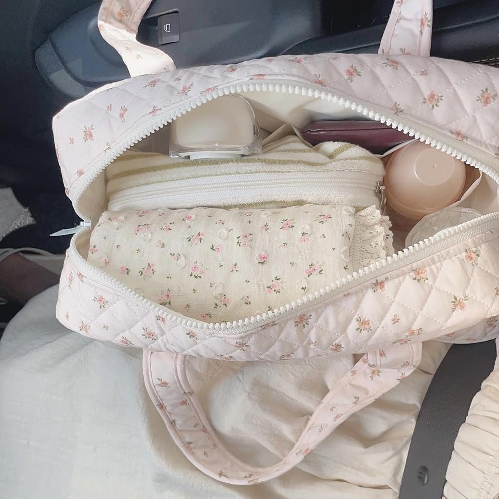 Quilted Duffle Bag For Women Cute Weekender Bag Floral Travel Bag Aesthetic Puffer Duffle Bag Cotton Diaper Tote Bag