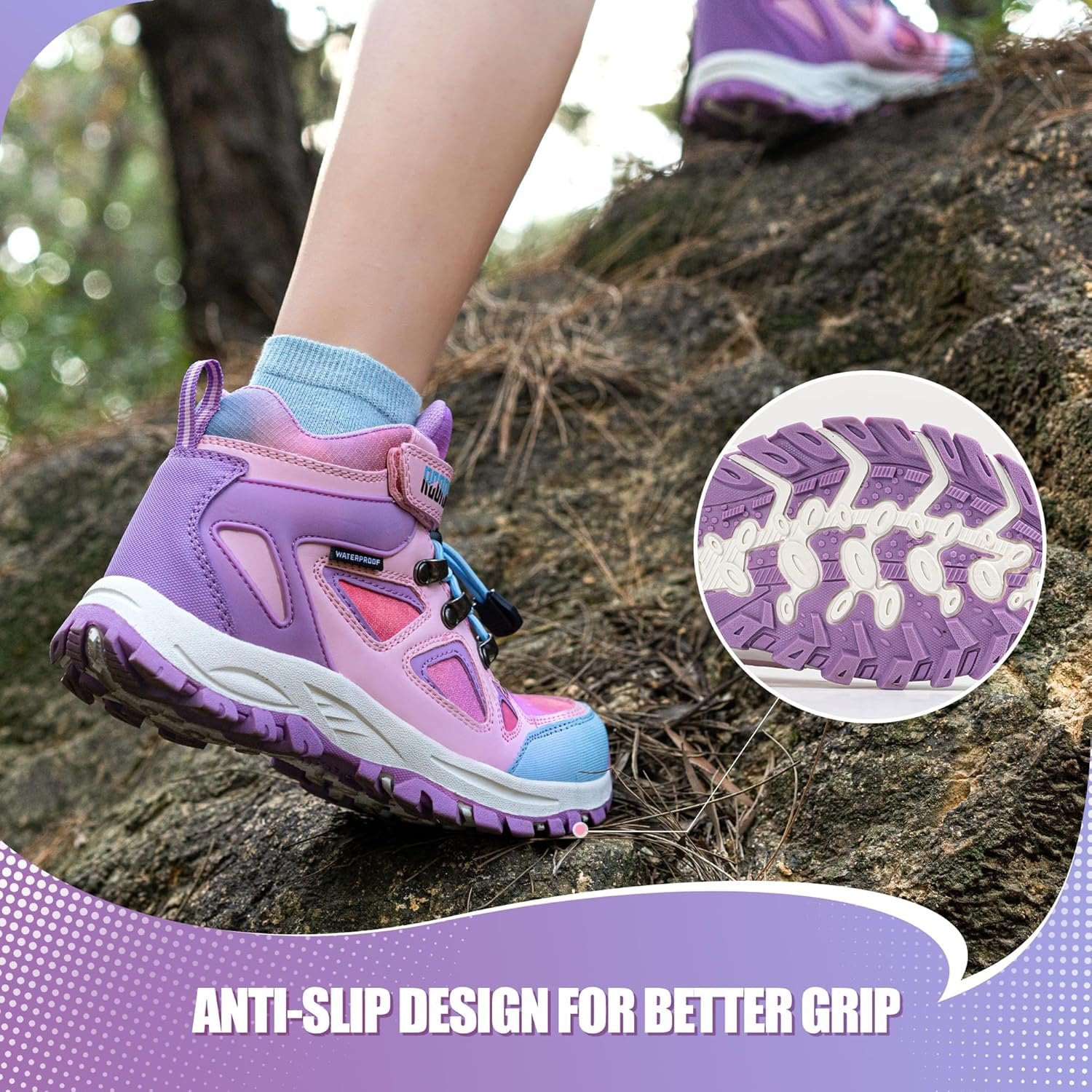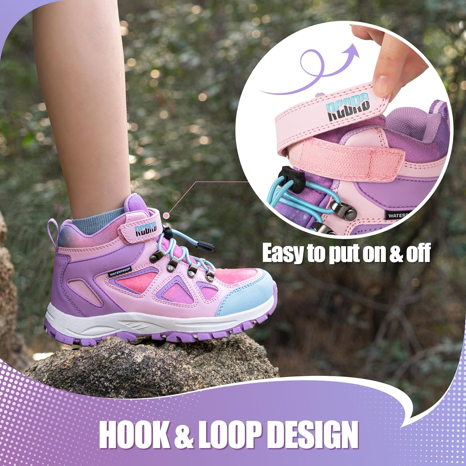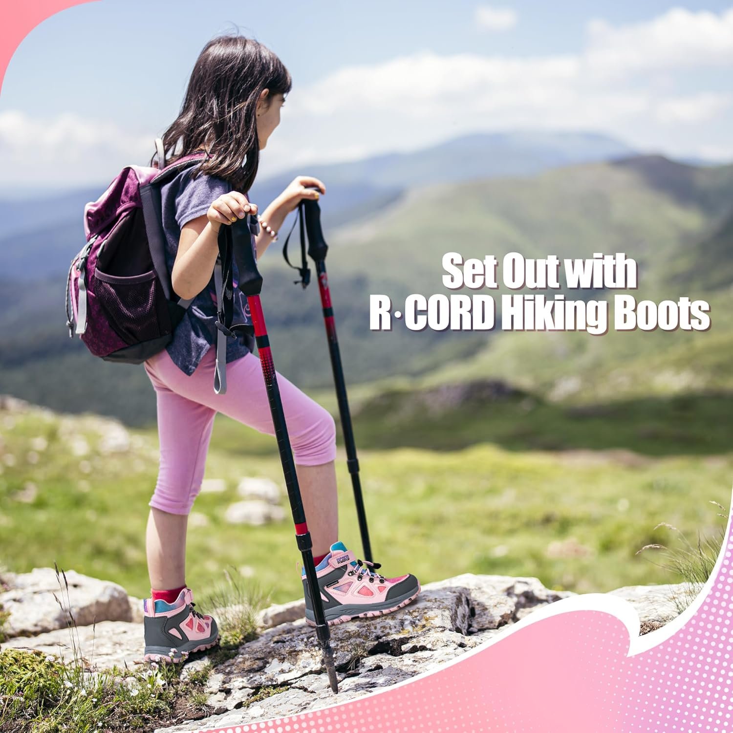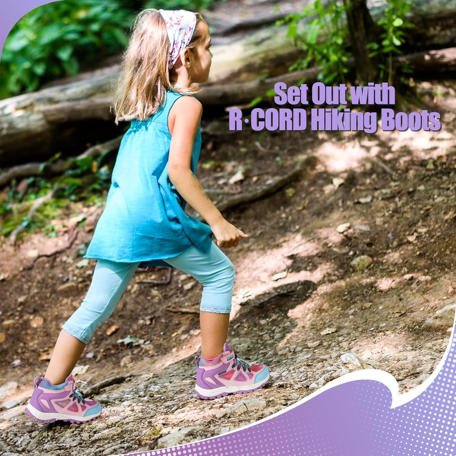 R CORD Kids Hiking Boots Waterproof Girls Hiking Boots Durable TPR Traction Outsole Anti-Skid Athletic Hook and Loop Drawstring Closure Hiking Boots for Outdoor