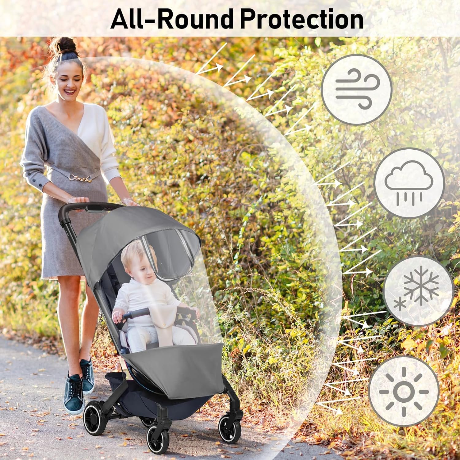 All-Weather Protection: Keep your little one perfectly sheltered in any season with our rain cover. The smart design combines complete weather protection with clever airflow vents and fixed straps, ensuring your baby stays comfortable during the ride.