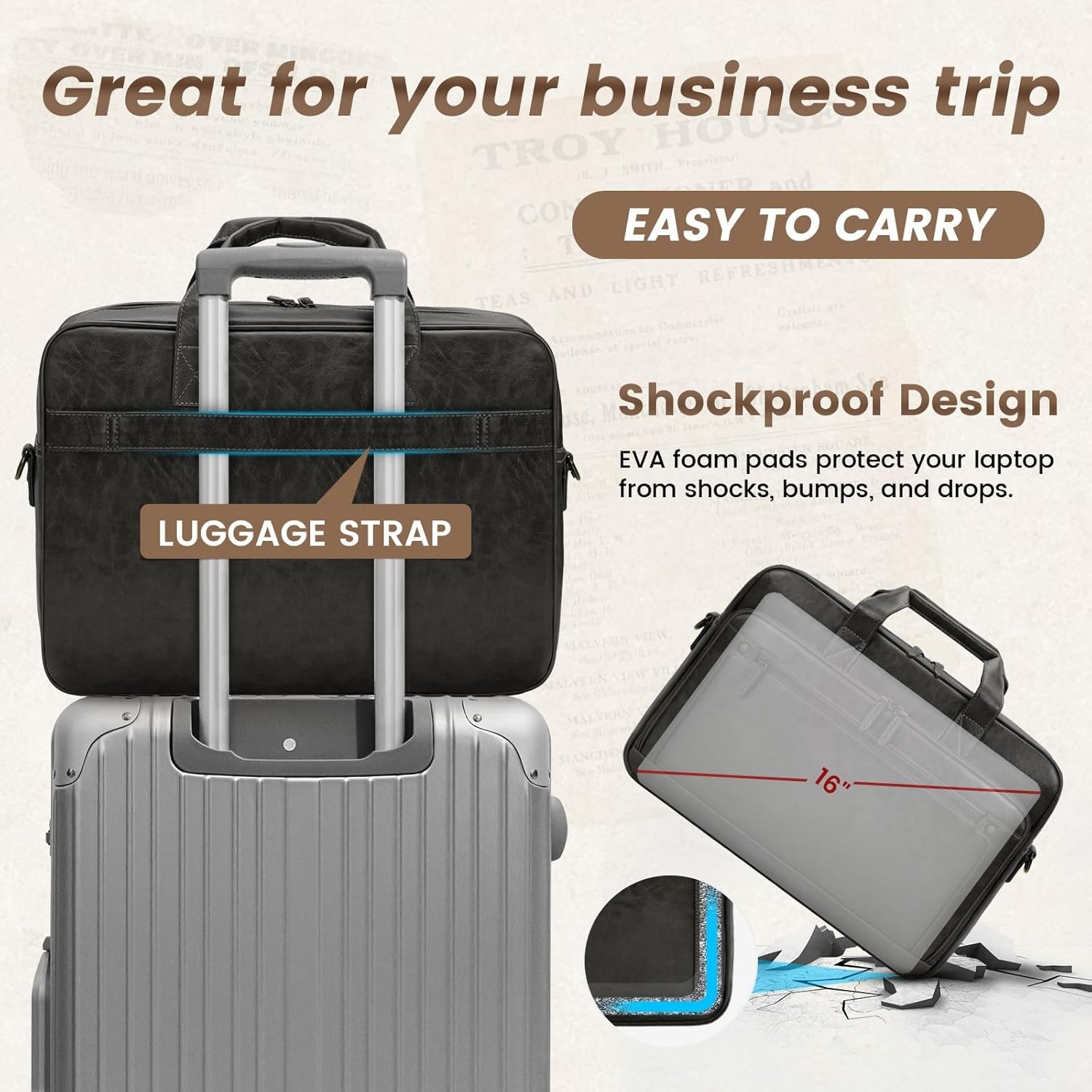 Durable & Vintage Laptop Briefcase: This laptop briefcase is made from soft-textured PU leather with a cowhide pattern and features metal zippers, durable antique brass hardware, and strong stitching for long-lasting reliability. The thick nylon lining and protective foam compartment ensure that your laptop is protected from impacts. Its design seamlessly blends practicality and style, making it a standout leather laptop bag for men, an essential briefcase, and a professional work bag.