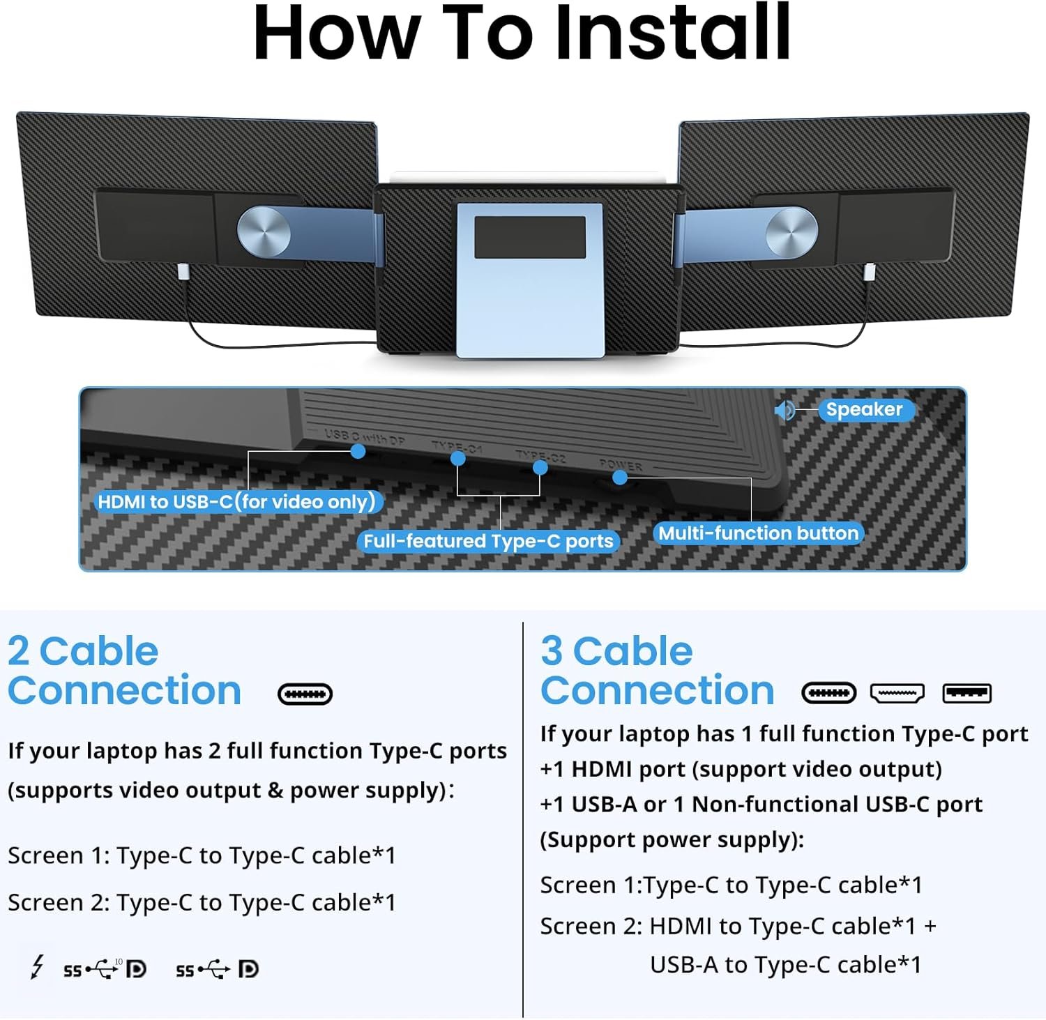 【Plug and Play, No Driver Required】This is a triple laptop screen extender for 13″-17.3″ laptops, whether you choose a USB-C, USB-A or HDMI connection, simply plug in the laptop screen extender and start your daily use without drivers. (Please note: When using the HDMI cable, connect an additional USB-A to USB-C cable on the same screen extender for power supply)