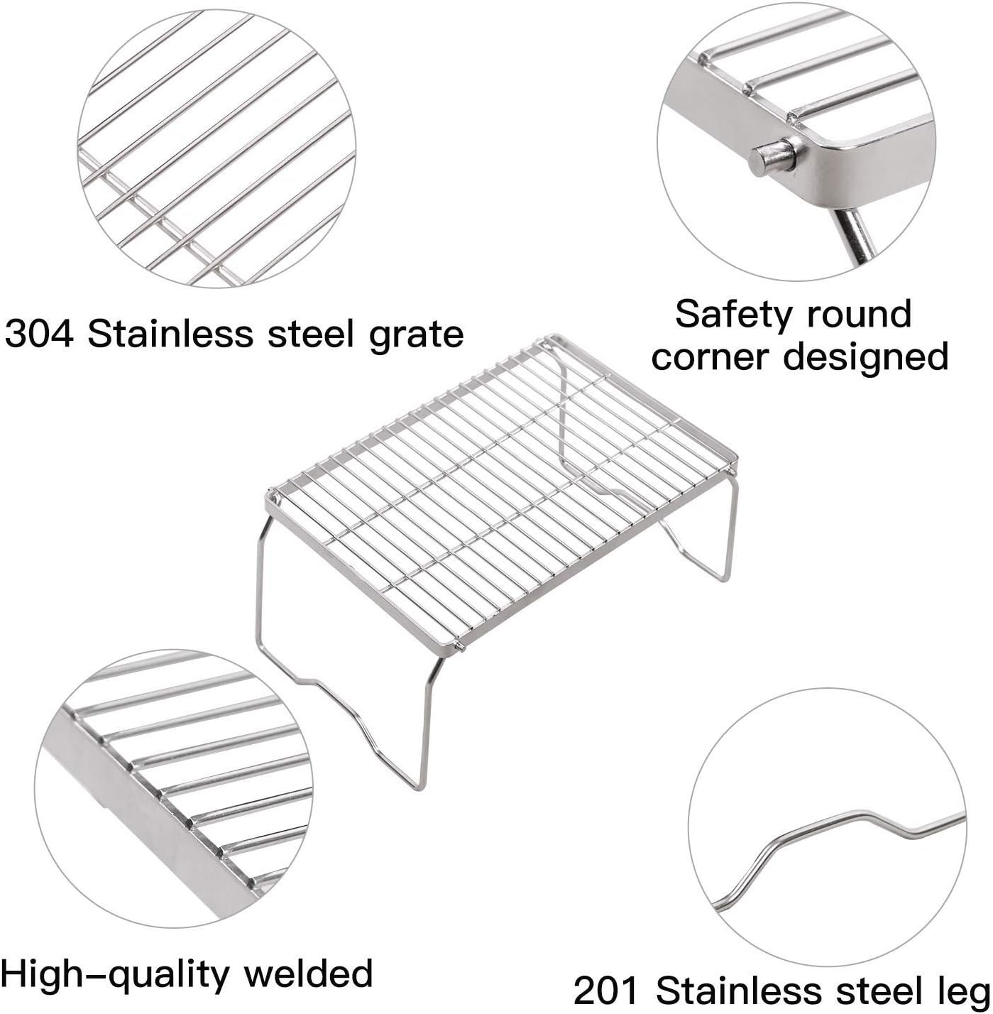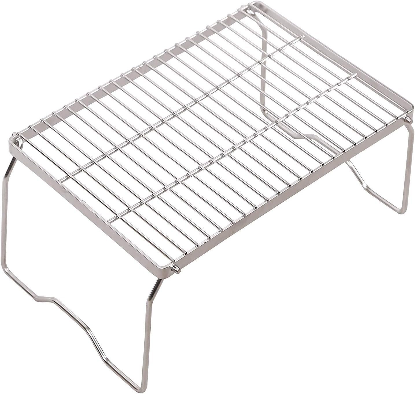 HIGH QUALITY MATERIAL: The over-the-fire camping grill is made of 304 stainless steel grate and the legs are made of 201 stainless steel. This helps the grill resist oxidation and corrosion. Stainless steel also makes it lighter and more durable than iron.