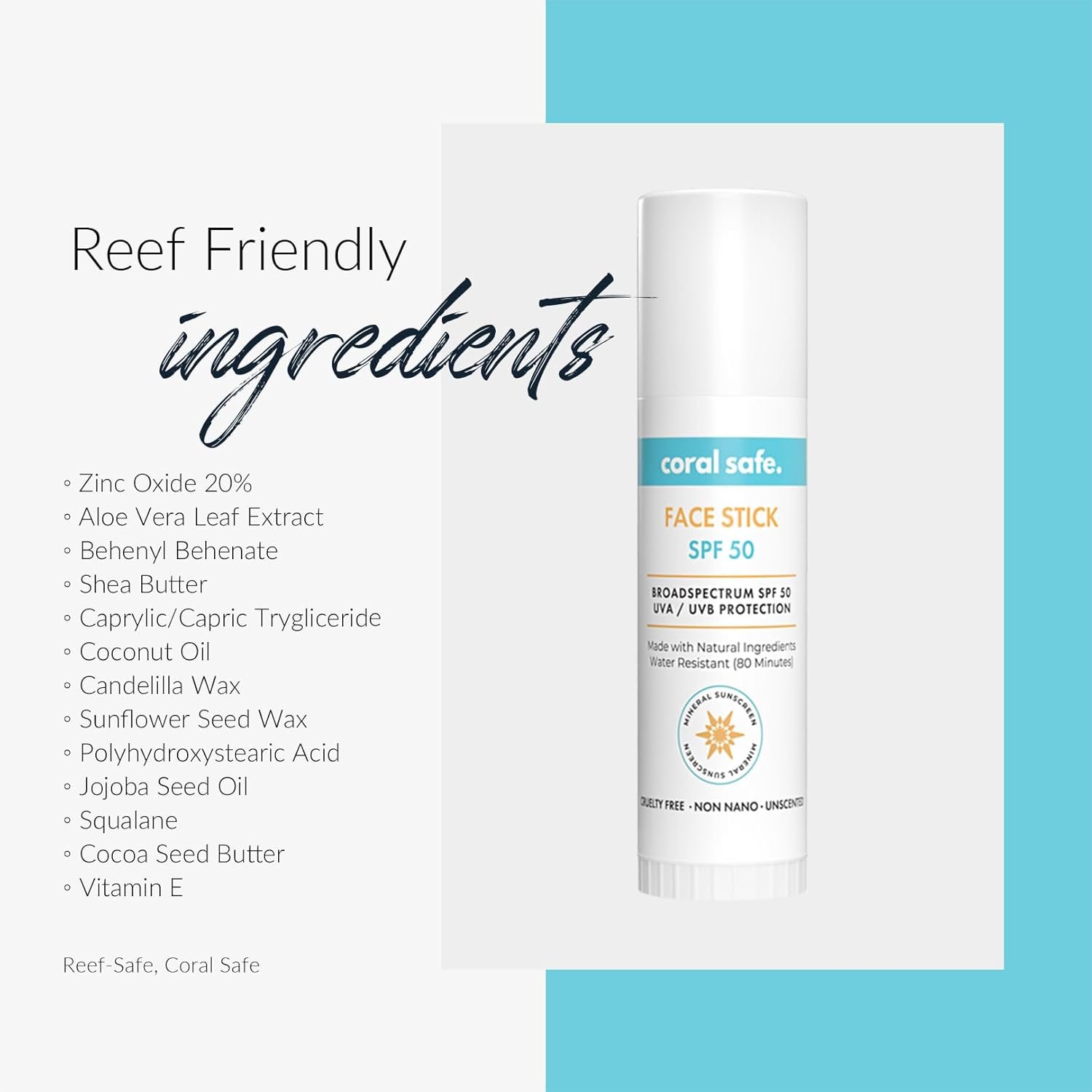 Reef Safe Sunscreen SPF 50 Facestick – Biodegradable, Hawaii & Mexico Approve, Zinc, Vitamin E, Oxybenzone & Octinoxate Free, Water Resistant, Natural Ingredients, Made in USA by Coral Safe