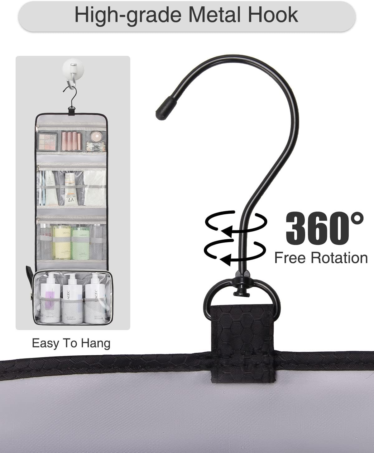 【CONVENIENT DESIGN】Stow-away 360 degree swivel non-slip metal hook for versatile hanging options. It fits bottles upright, helps eliminate spills, and makes a great travel organizer for your travel toiletries.