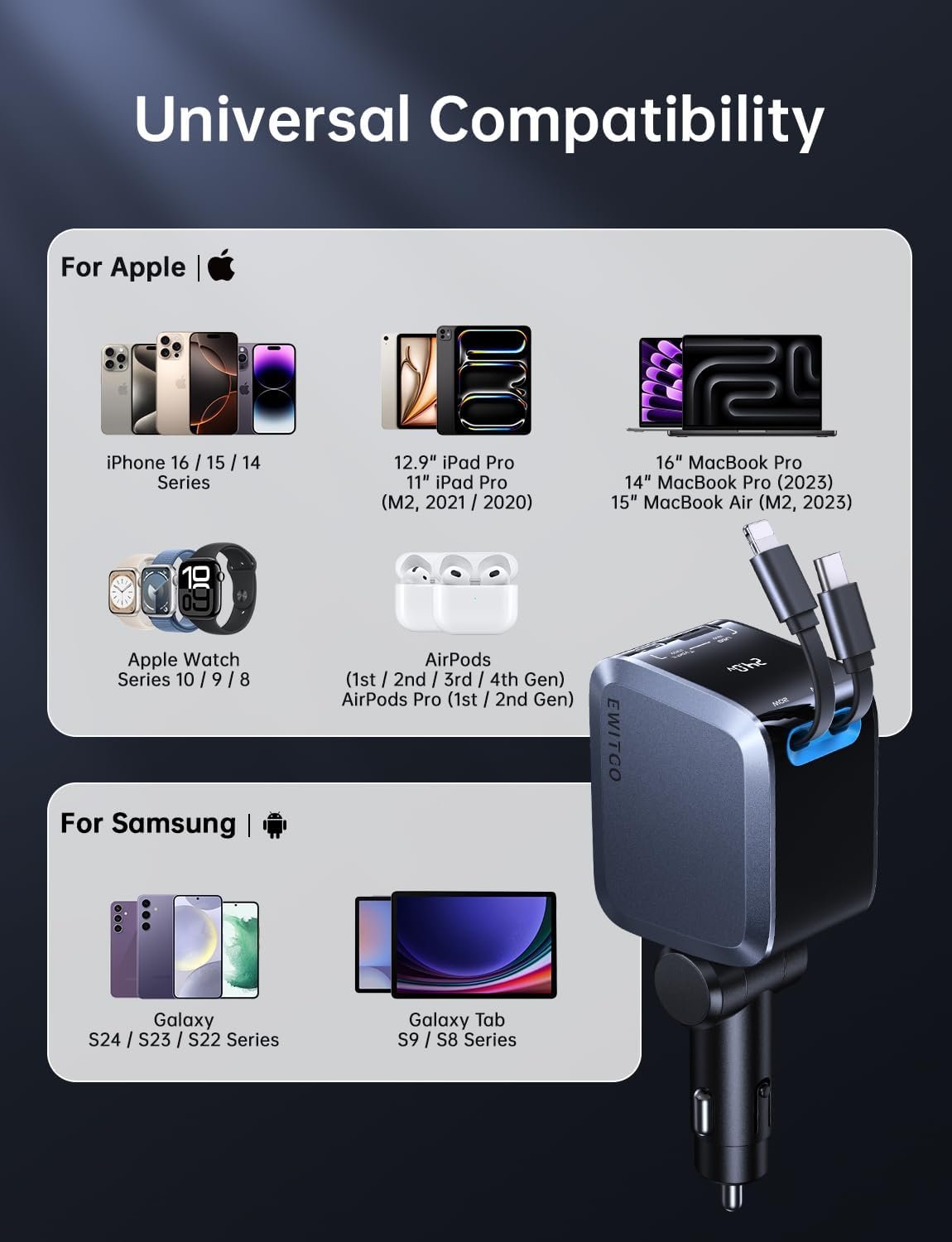Sustainable and Reliable: EWITGO prioritizes eco-friendly practices while delivering durable, long-lasting products. The EWITGO retractable fast car charger reduces the need for frequent replacements, making it a sustainable choice for those seeking a car charger with different charging ports. Whether you’re shopping for car gifts for men or reliable semi truck accessories, this charger is built to last