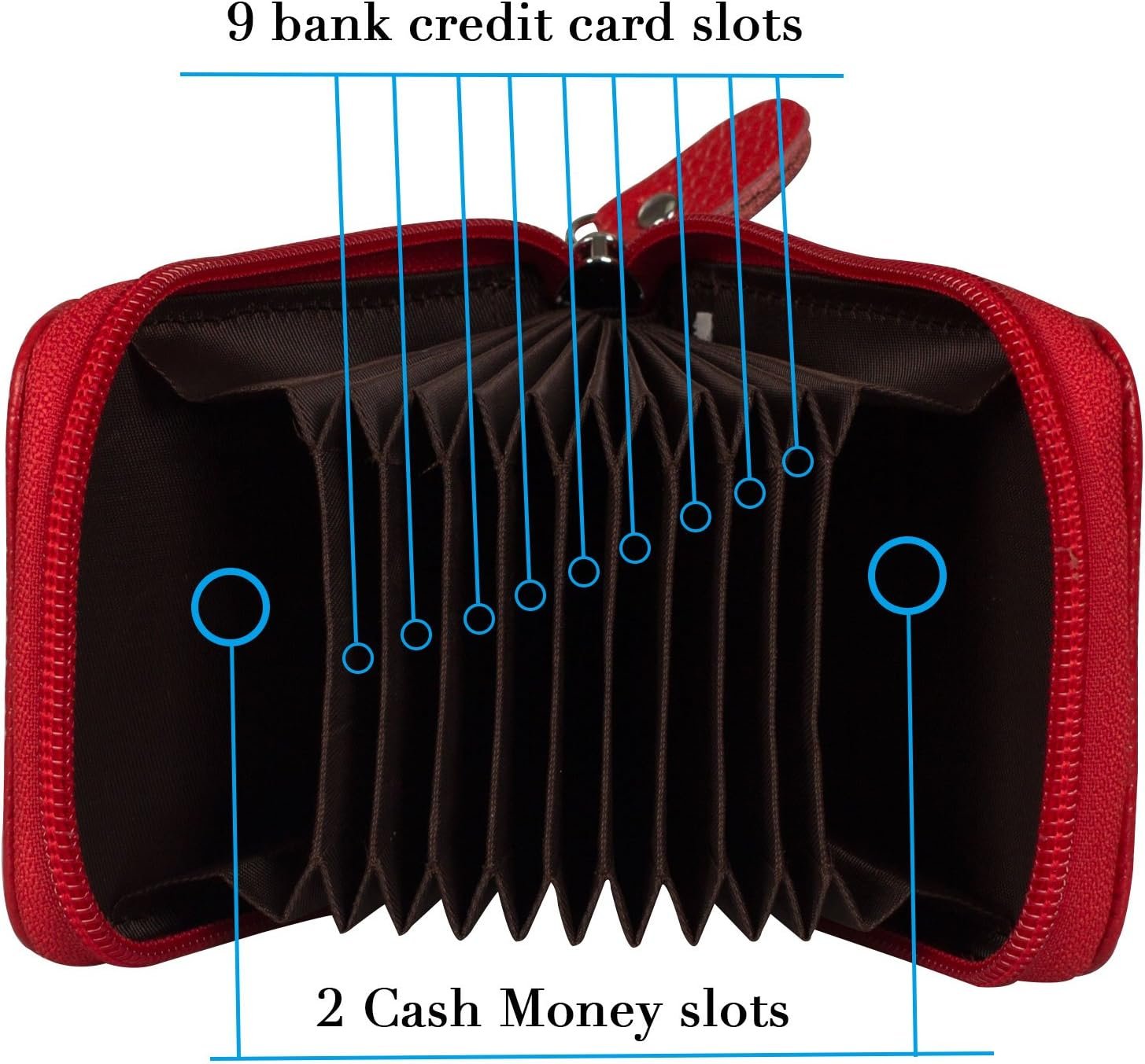 1, It can be expanded like an accordion with 9 card slots inside including 2 cash slots, and 1 clear slot and 1 card slot outside.