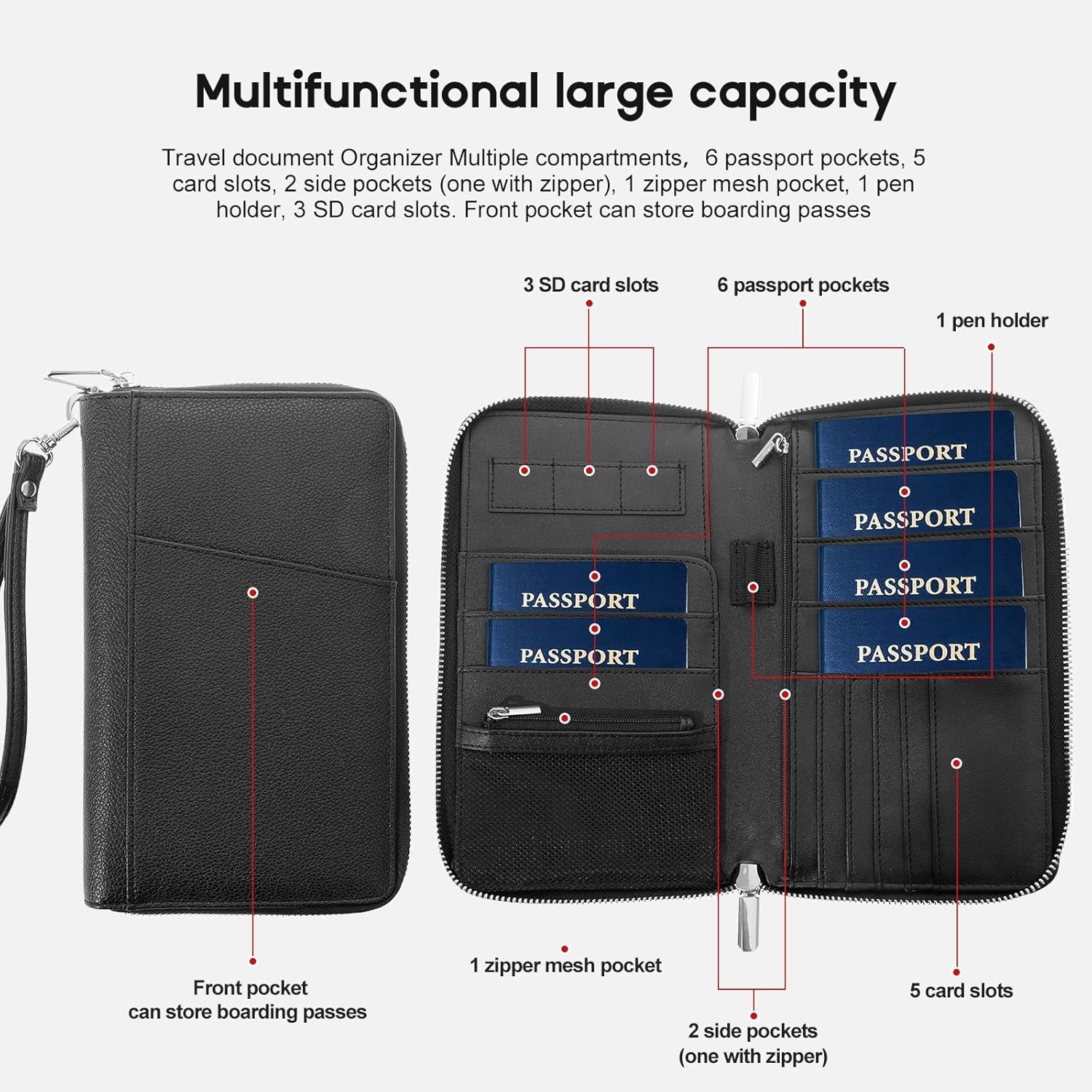 3.Travel document Organizer Multiple compartments,6 passport pockets, 5 card slots, 2 side pockets (one with zipper), 1 zipper mesh pocket, 1 pen holder, 3 SD card slots. Front pocket can store boarding passes