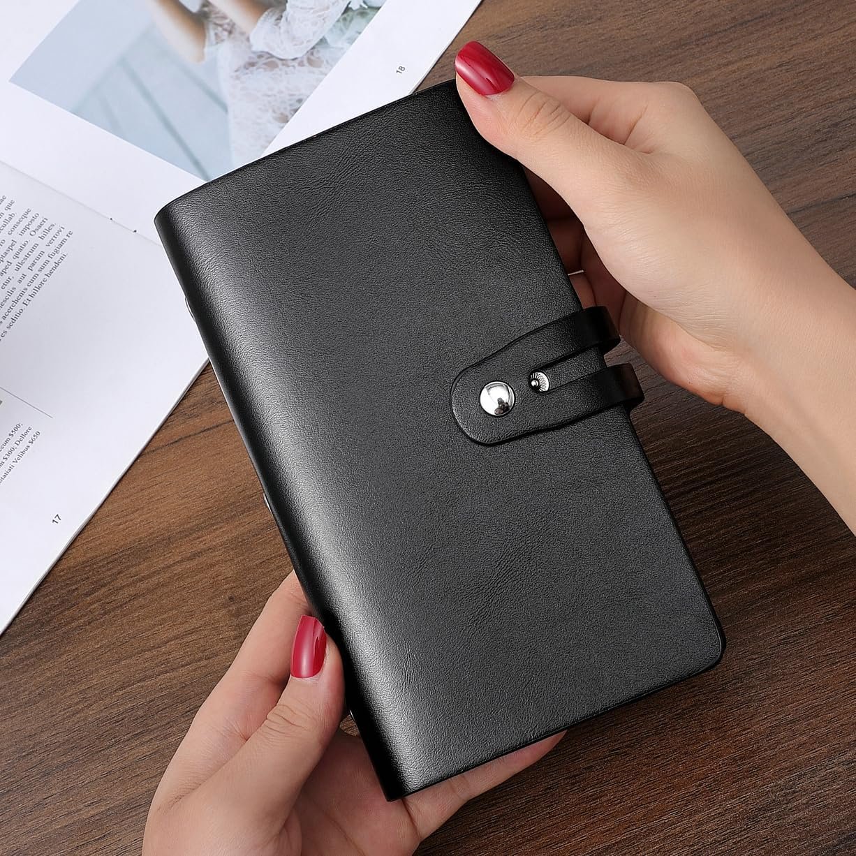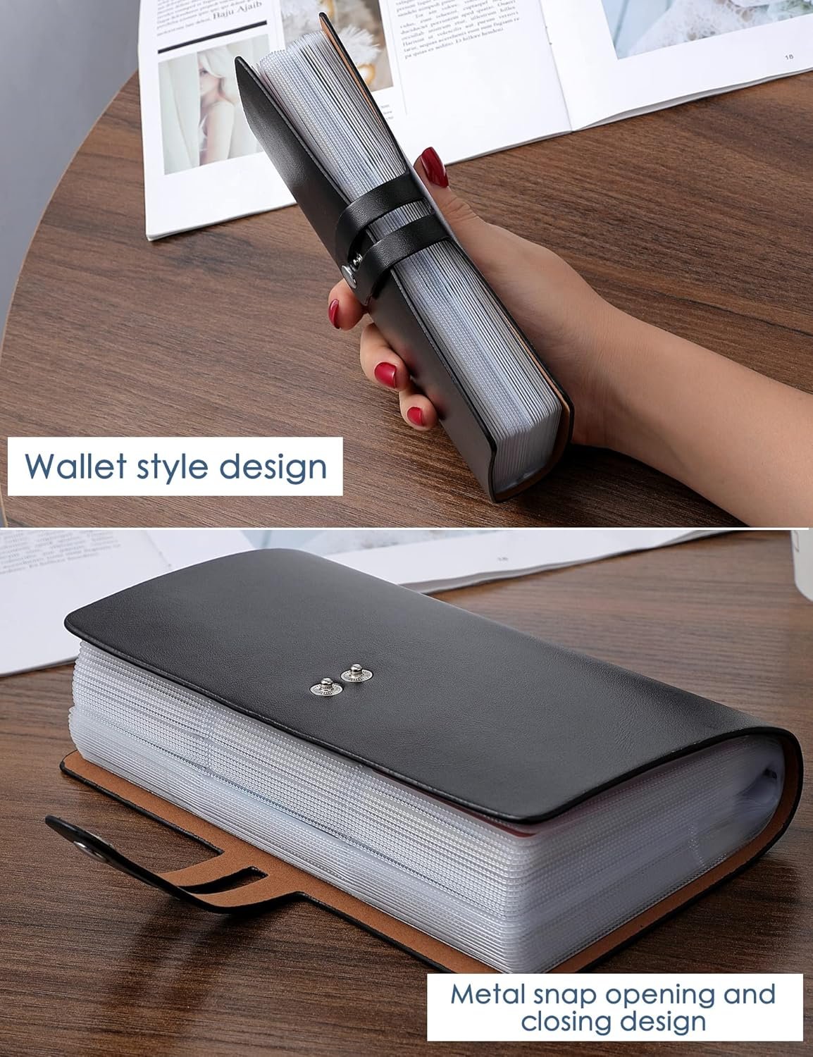 Easy to read and manage cards: The internal card slot is made of translucent plastic. The translucent card holder page clearly shows the picture and text of the card in the card holder so you can read and manage the card. Securing all cards in a credit card holder with two rows of adjustable elastic metal buttons is the best way to prevent the loss of important credit cards.
