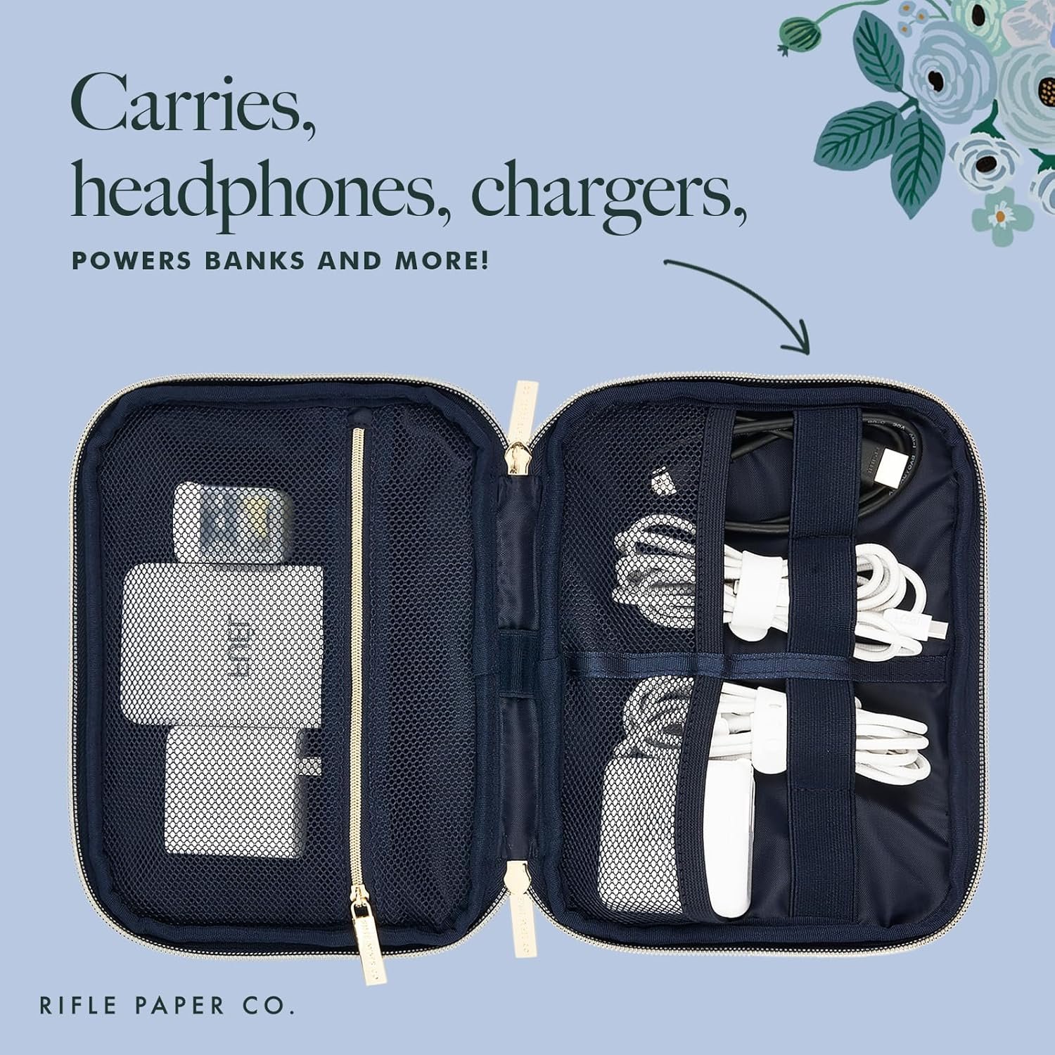 Rifle Paper Co. Electronic Organizer Travel Case – Portable Tech Pouch w/Multiple Storage Mesh Pockets for Cable, Cord, Charger, Power Bank, AirPods – Airplane Travel Essentials Bag -Garden Party Blue