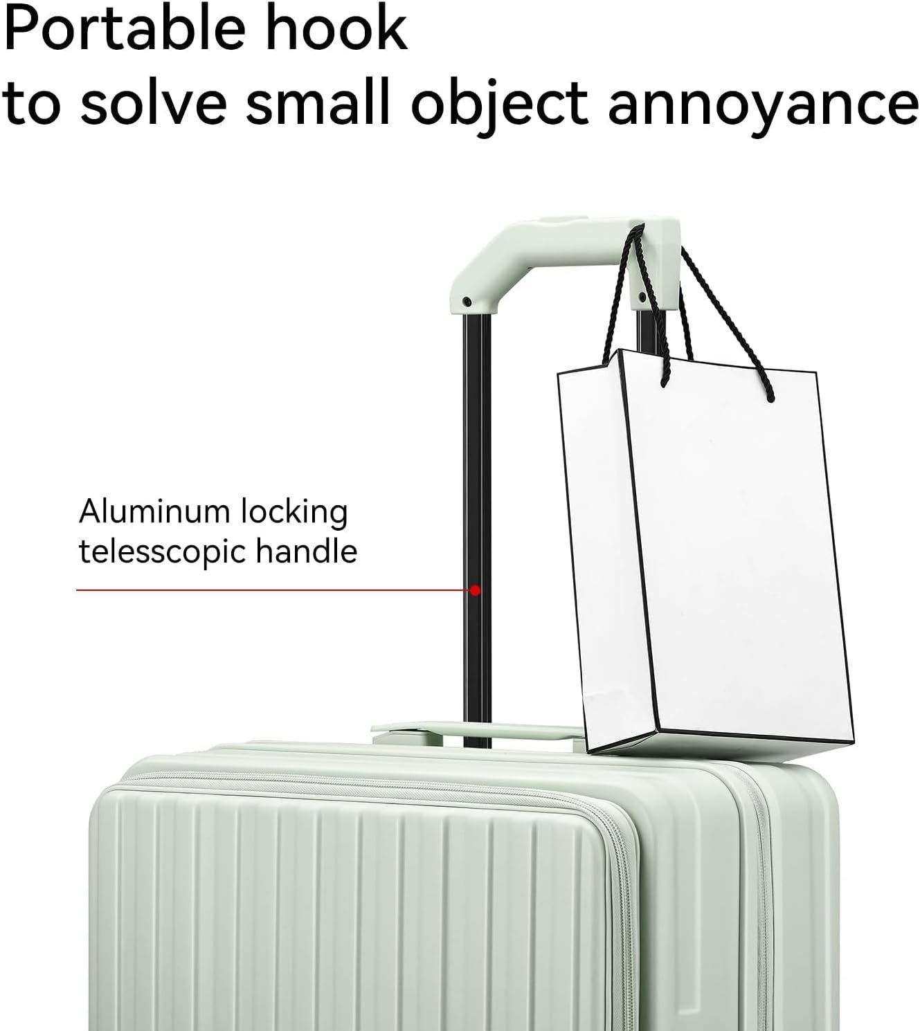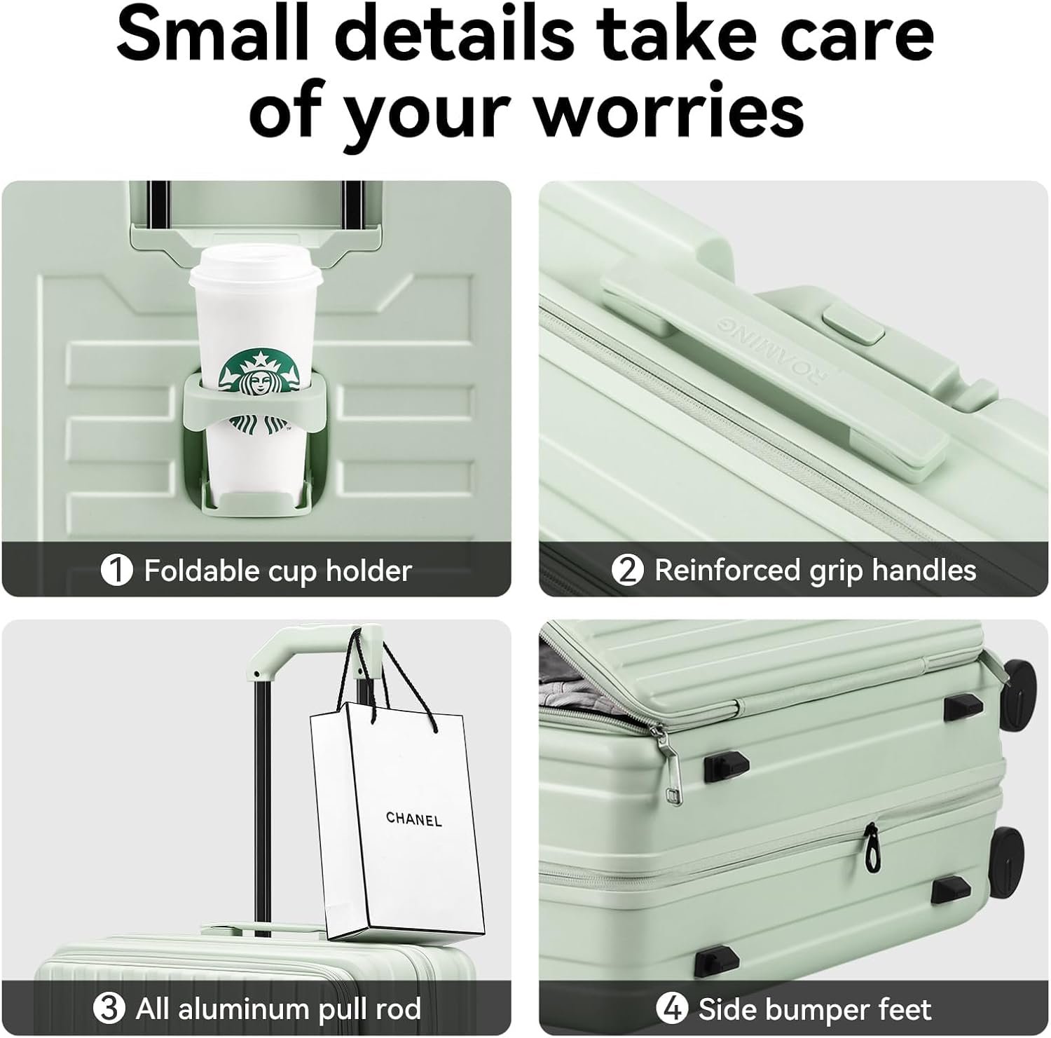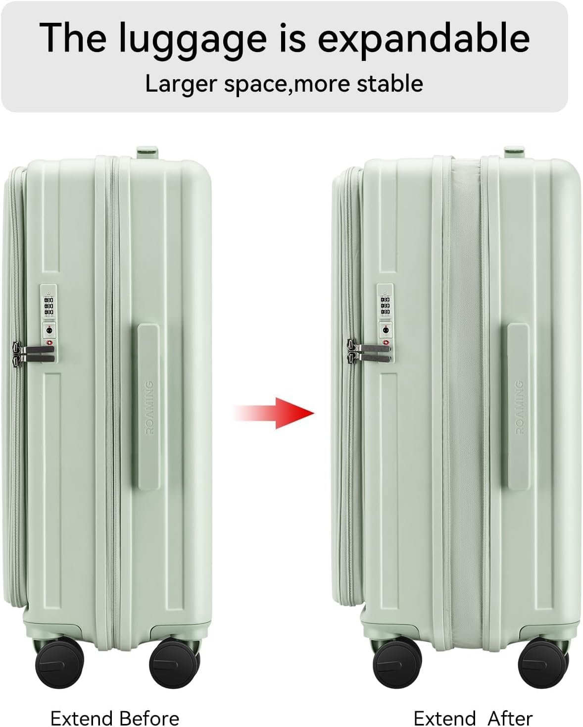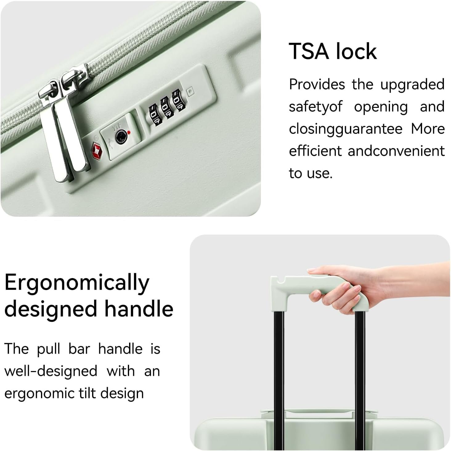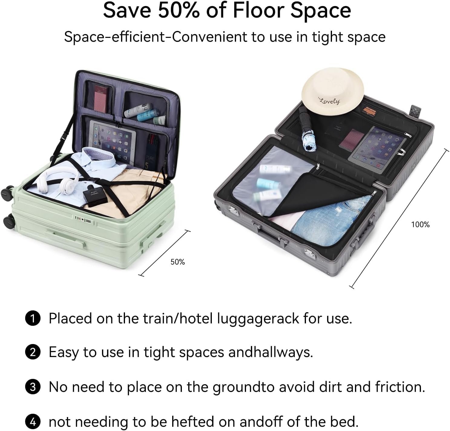 【CREATIVE FRONT OPENING】 Leading the future opening and closing method which is effortless to open or close the suitcase, not only is it easy to load, but it also saves space. This design solves the problem that traditional luggage separated 2 compartments of heavy load then it’s difficult to open and close.Importantly, it also avoid the displacement of items