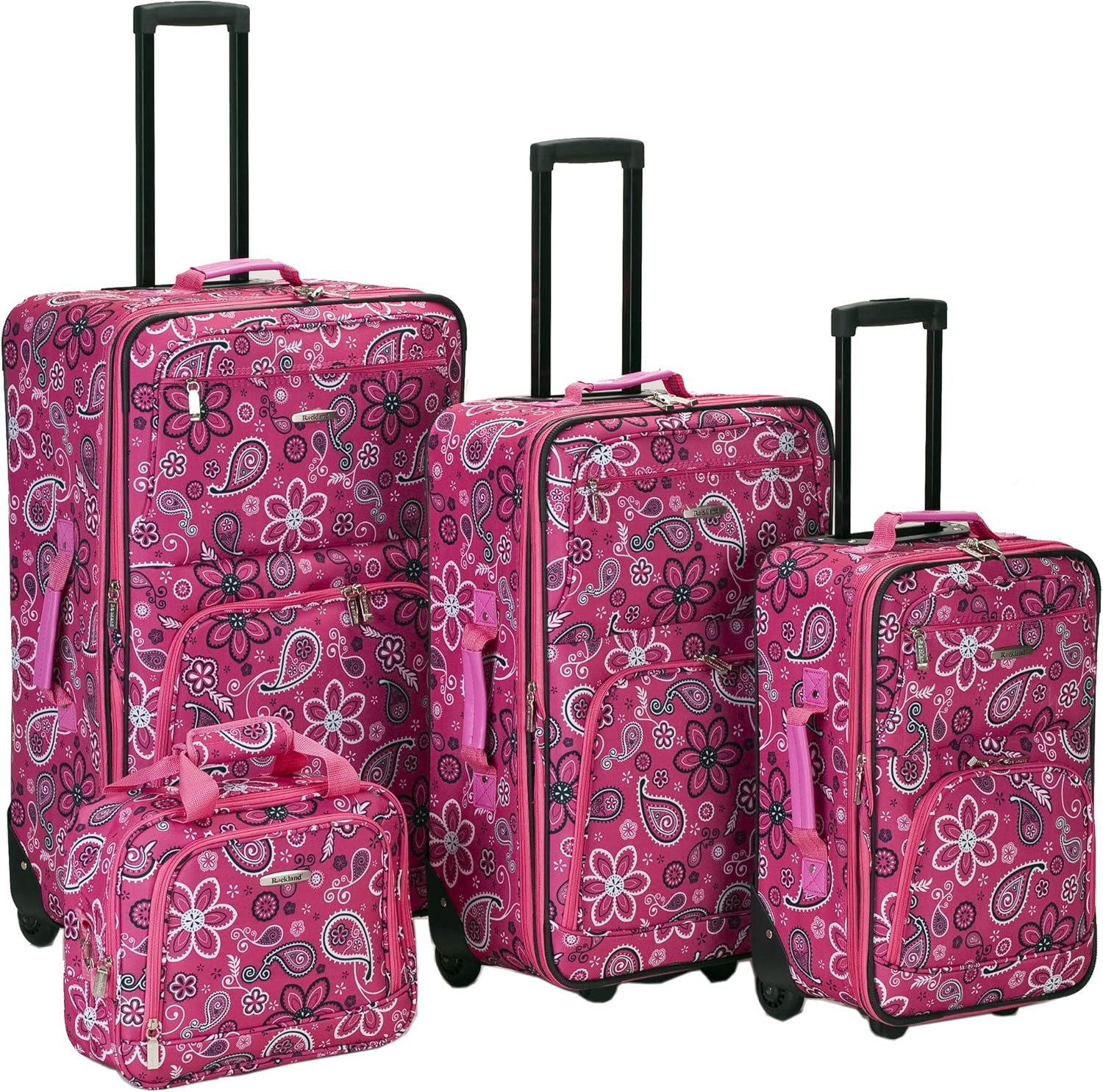 This beautiful deluxe 4-Piece expandable luggage set is manufactured with a patented heavy duty EVA-molded hi-count fabric. This set is perfect for the serious and experienced traveler! Manufactured with the very best heavy duty polyester and PVC backing, this luggage set is designed for the traveler on the go and comes with three expandable uprights and a flight tote bag. It comes packed with features including: an inside retractable handle, EZ-Roll in-line skate wheels, back zippered secured pockets, top and side comfort grip handle, stability bars at the bottom to avoid tilting, and locks & keys. Upright features include: Clear in-line skate wheel system for smooth ride Push-button self-locking internally stored retractable handle system Ergonomic and comfortable padded top and side grip handles Two front full size zipper-secured pockets Three internal organizational pockets for all your traveling needs Each upright’s interior is fully lined with a durable and elegantly imprinted lining Elegant silver pewter heavy duty industrial hardware Carry-On Flight Tote Bag features include: Elegantly imprinted full interior lining Detachable and adjustable non-slip shoulder strap Spacious main compartment Maximum strength industrial hardware 19-inch Carry-on Upright: 20 inches high x 12. 5 inches wide x 7. 5 inches expandable to 10 inches deep (with wheels). 6 lbs. 24-inch Upright: 24 inches high x 16 inches wide x 10 inches expandable to 12 inches deep. 8 lbs. 28-inch Upright: 28 inches high x 18 inches wide x 12 inches expandable to 14 inches deep. 9 lbs. Carry-On Flight Tote Bag: 14 inches wide x 11 inches high x 5 inches deep – 1 lb.