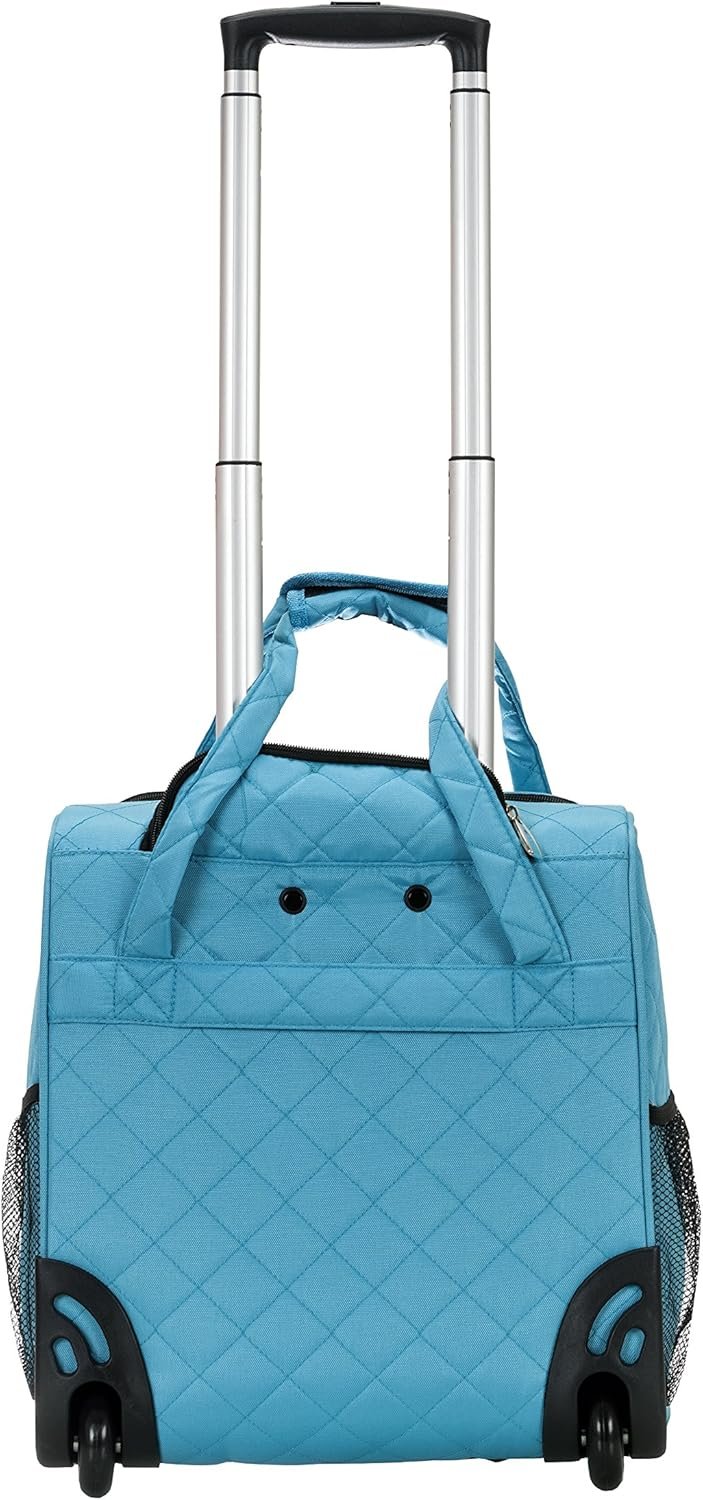Carry all your essentials in style and comfort with the Rockland wheeled under seat carry-on bag. Quilted polyester fabric exterior features a large main compartment for clothes, shoes and also has 2 slip pockets and two zippered pockets for keeping small essentials handy and organized. Retractable handle stores away while hand held handles allow for quickly grabbing bag from overhead bin or underneath seat. Back side has a strap allowing you to attach it to your wheeled carry on piece. This makes the perfect bag for overnight trips and the small size fits under near most airline seats allowing you to carry on your bag even when overhead bins are full.